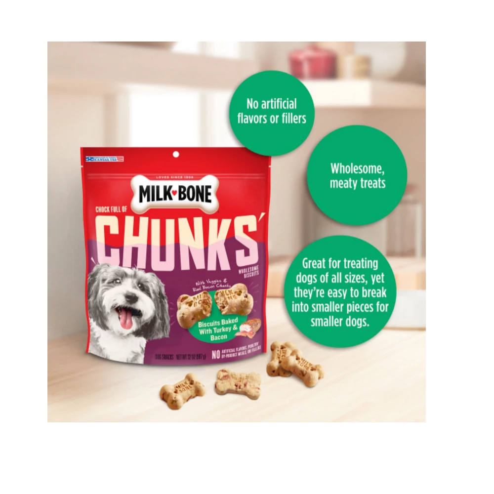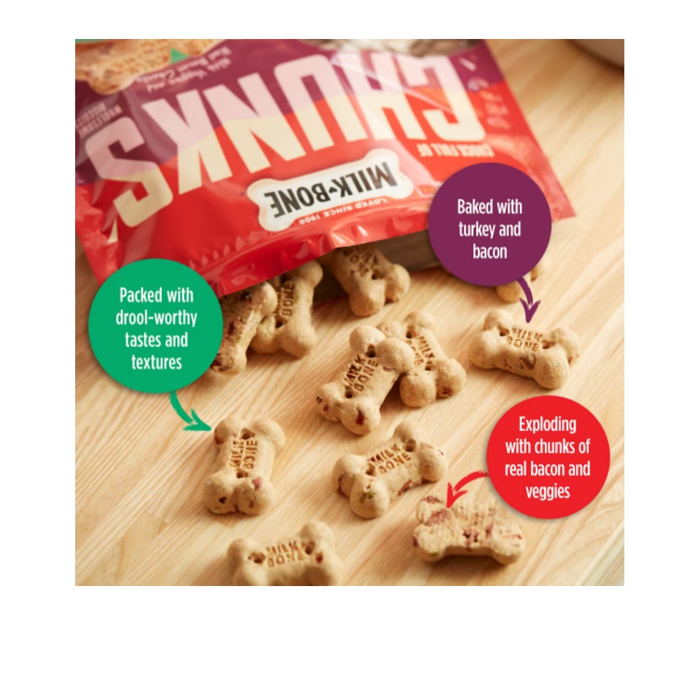 Your meat-loving mate is sure to go crazy for Milk-Bone Chock Full of Chunks Treats! These tasty baked biscuits feature a combination of turkey, bacon, and veggies, giving them tons of flavor and a wag-worthy texture. Made without poultry by-product meals, fillers, or artificial flavors, you won’t have to worry about what your furkid is snacking on. You’ll also appreciate that they can be broken into smaller pieces to accommodate small adult dogs. Filled with meaty flavor and nuggets of tasty goodness, no treat drawer is complete without a bag of Milk-Bone Chock Full of Chunks!