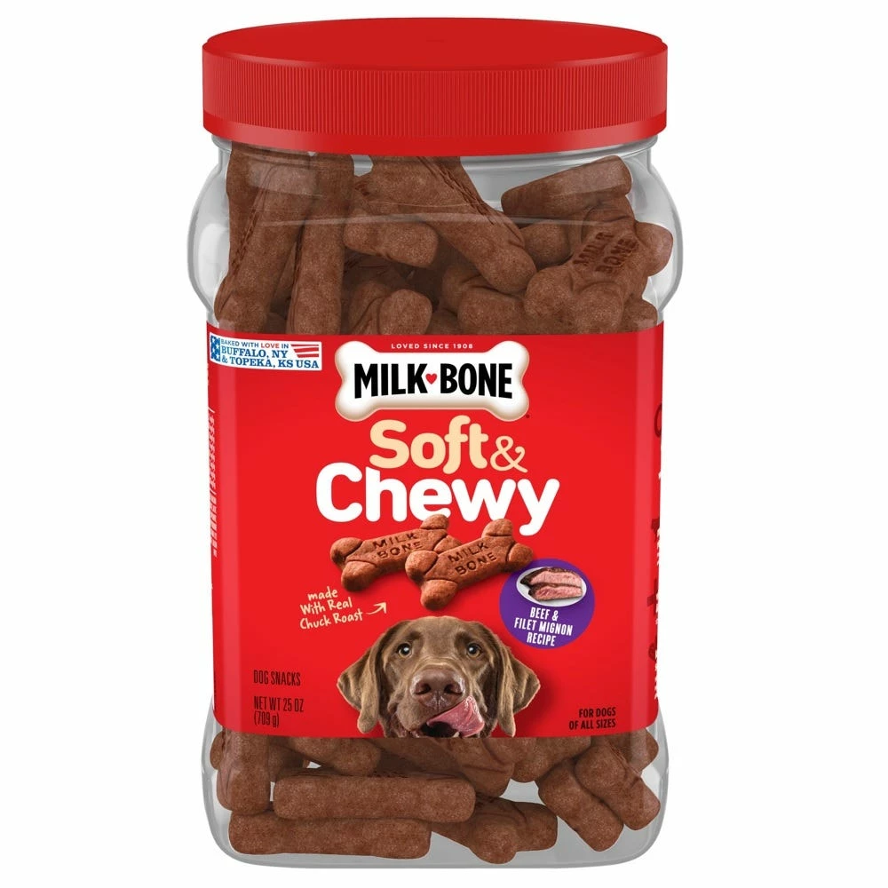 Milk-Bone Soft & Chewy Beef & Filet Mignon Recipe Dog Treats are savory, tender treats made with real beef and filet mignon infused with a natural smoke flavor. Their gourmet meaty taste is sure to spark pure joy in your pup as soon as he hears the crinkle of the bag and smells the delicious aroma of premium beef. With their pliable texture, these bone-shaped snacks are easier to chew and make the perfect reward for dogs with tender gums, senior dogs or any dog that prefers a softer treat. You can feel good about giving your pup such a decadent treat because it’s fortified with 12 vitamins and minerals to help keep dogs at their best.