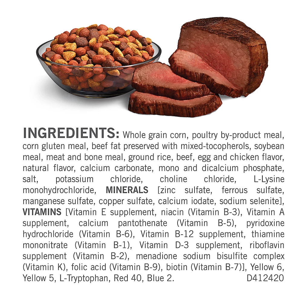 Whole Grain Corn, Poultry By-Product Meal, Corn Gluten Meal, Beef Fat Preserved With Mixed-Tocopherols, Soybean Meal, Meat And Bone Meal, Ground Rice, Beef, Egg And Chicken Flavor, Natural Flavor, Calcium Carbonate, Mono And Dicalcium Phosphate, Salt, Potassium Chloride, Choline Chloride, L-Lysine Monohydrochloride, MINERALS [Zinc Sulfate, Ferrous Sulfate, Manganese Sulfate, Copper Sulfate, Calcium Iodate, Sodium Selenite], VITAMINS [Vitamin E Supplement, Niacin (Vitamin B-3), Vitamin A Supplement, Calcium Pantothenate (Vitamin B-5), Pyridoxine Hydrochloride (Vitamin B-6), Vitamin B-12 Supplement, Thiamine Mononitrate (Vitamin B-1), Vitamin D-3 Supplement, Riboflavin Supplement (Vitamin B-2), Menadione Sodium Bisulfite Complex (Vitamin K), Folic Acid (Vitamin B-9), Biotin (Vitamin B-7)], Yellow 6, Yellow 5, L-Tryptophan, Red 40, Blue 2. D412420