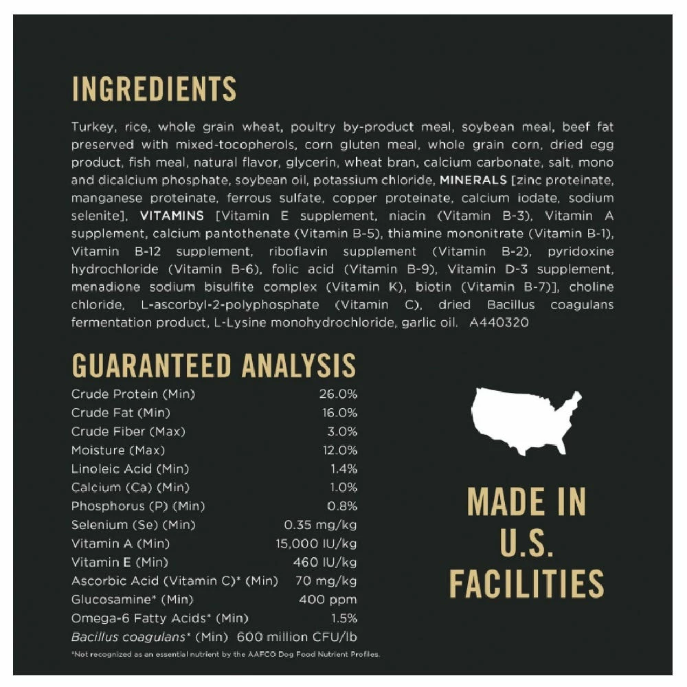 Turkey, Rice, Whole Grain Wheat, Poultry By-Product Meal, Soybean Meal, Beef Fat Preserved With Mixed-Tocopherols, Corn Gluten Meal, Whole Grain Corn, Dried Egg Product, Fish Meal, Natural Flavor, Glycerin, Wheat Bran, Calcium Carbonate, Salt, Mono And Dicalcium Phosphate, Soybean Oil, Potassium Chloride, MINERALS [Zinc Proteinate, Manganese Proteinate, Ferrous Sulfate, Copper Proteinate, Calcium Iodate, Sodium Selenite], VITAMINS [Vitamin E Supplement, Niacin (Vitamin B-3), Vitamin A Supplement, Calcium Pantothenate (Vitamin B-5), Thiamine Mononitrate (Vitamin B-1), Vitamin B-12 Supplement, Riboflavin Supplement (Vitamin B-2), Pyridoxine Hydrochloride (Vitamin B-6), Folic Acid (Vitamin B-9), Vitamin D-3 Supplement, Menadione Sodium Bisulfite Complex (Vitamin K), Biotin (Vitamin B-7)], Choline Chloride, L-Ascorbyl-2-Polyphosphate (Vitamin C), Dried Bacillus Coagulans Fermentation Product, L-Lysine Monohydrochloride, Garlic Oil.