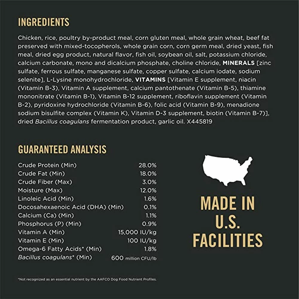 Chicken, Brewer’s Rice, Poultry By-Product Meal, Corn Gluten Meal, Whole Grain Wheat, Animal Fat Preserved With Mixed-Tocopherols, Whole Grain Corn, Corn Germ Meal, Brewer’s Dried Yeast, Fish Meal, Animal Digest, Dried Egg Product, Fish Oil, Salt, Potassium Chloride, Calcium Carbonate, Calcium Phosphate, Choline Chloride, Zinc Sulfate, Vitamin E Supplement, Ferrous Sulfate, Niacin, Manganese Sulfate, L-Lysine Monohydrochloride, Vitamin A Supplement, Calcium Pantothenate, Thiamine Mononitrate, Copper Sulfate, Riboflavin Supplement, Garlic Oil, Vitamin B-12 Supplement, Pyridoxine Hydrochloride, Folic Acid, Vitamin D-3 Supplement, Calcium Iodate, Biotin, Menadione Sodium Bisulfite Complex (Source Of Vitamin K Activity), Sodium Selenite.Â
