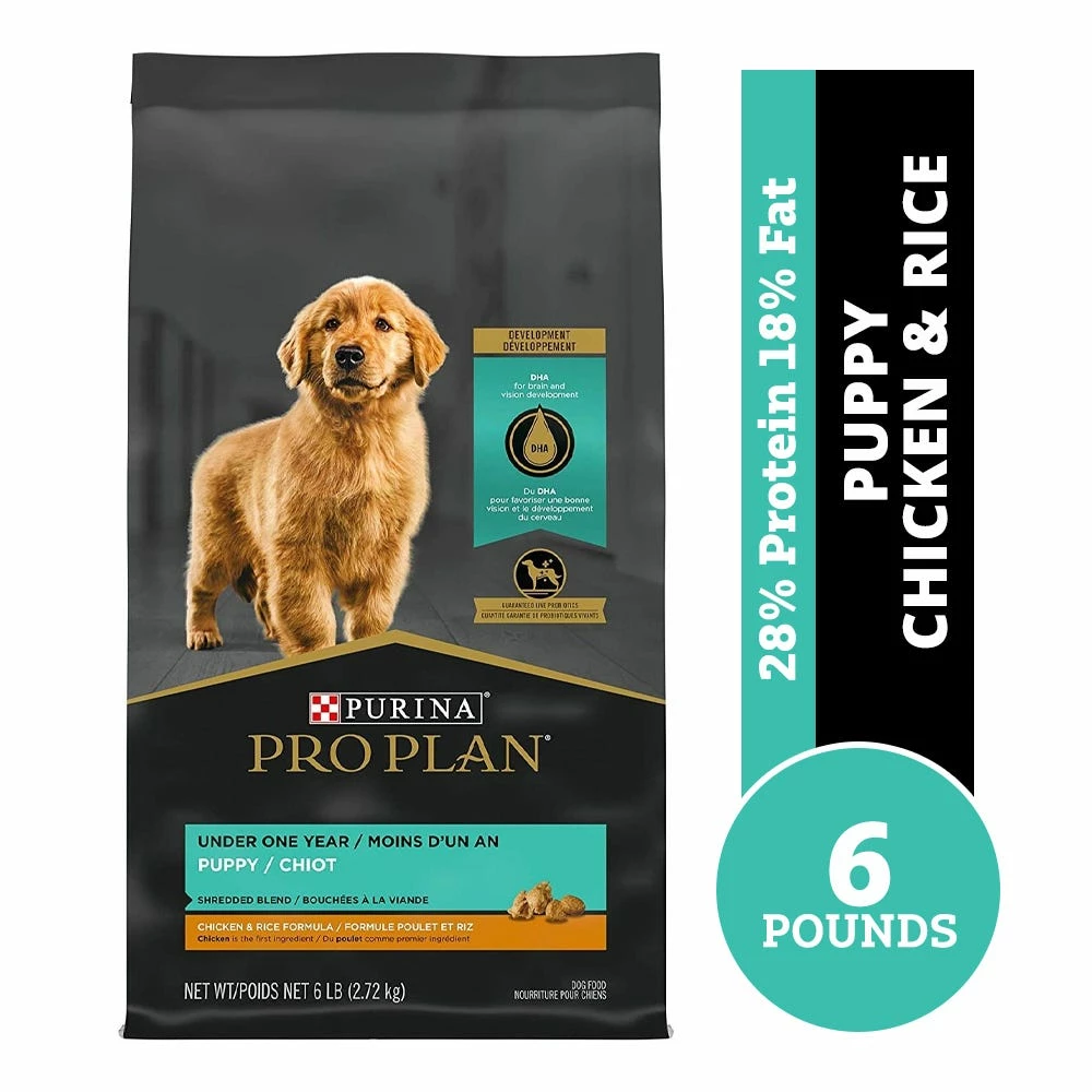 Care for your puppy’s nutritional needs with Purina Pro Plan FOCUS Chicken & Rice Formula puppy dry dog food. High-quality protein sources, including chicken as the #1 ingredient, help your puppy develop healthy muscles so that he can maintain his playful lifestyle. DHA from omega-rich fish oil in this puppy formula helps to nourish his brain and vision development, and calcium, phosphorus, and other minerals help to build strong teeth and bones. This super-premium dog food will keep your puppy happy at mealtime, and you can have confidence he is getting the 100% complete and balanced nutrition his body needs at this early stage of development. Offer up this Purina Pro Plan FOCUS puppy food recipe to show your puppy you care about his overall health and well-being while giving him a food designed to meet the unique nutritional needs of your growing puppy.; Give your puppy everything he needs to grow up healthy and strong when you serve Purina Pro Plan FOCUS Chicken & Rice Formula puppy dry dog food. Real chicken as the first ingredient in this puppy dry food helps provide the essential building blocks for the protein needs within your dog’s body, and every high-quality ingredient is carefully chosen for a specific nutritional or functional purpose. This antioxidant-rich dry puppy food formula helps support your puppy’s developing immune system, while the vitamin A and linoleic acid, an omega-6 fatty acid, help to promote his healthy skin and coat. As your puppy grows into his adult years, gradually transition to our line of Purina Pro Plan wet and dry dog foods designed specifically for adult dogs, and let him enjoy a variety of tempting tastes and textures while you provide outstanding nutrition. Ten out of the last 10 Westminster Best in Show Champions were fueled by Purina Pro Plan. We know that your dog’s health and happiness are important to you, and that’s why Purina Pro Plan dog food is backed by the work and research of over 400 scientists, including nutritionists, veterinarians, and behaviorists, to help make it beneficial to your dog’s health and appealing to his taste buds. Purina Pro Plan was the first dry dog food brand to use and be founded on the idea of using real meat as the #1 ingredient. Proudly manufactured by Purina in company-owned facilities in the United States, each batch undergoes rigorous quality and safety checks to provide you with added peace of mind, and we make quality the top priority in everything we do. So fill his dish with Purina Pro Plan FOCUS Chicken & Rice Formula puppy dry dog food, and give him the specialized nutrition he needs to be his best puppy self.