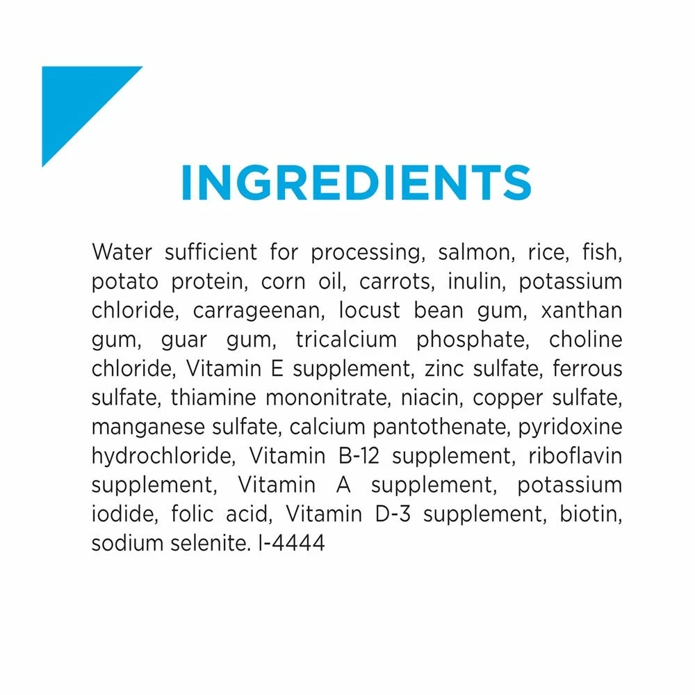 Water Sufficient For Processing, Salmon, Rice, Fish, Potato Protein, Corn Oil, Carrots, Inulin, Potassium Chloride, Carrageenan, Locust Bean Gum, Xanthan Gum, Guar Gum, Tricalcium Phosphate, Choline Chloride, Vitamin E Supplement, Zinc Sulfate, Ferrous Sulfate, Thiamine Mononitrate, Niacin, Copper Sulfate, Manganese Sulfate, Calcium Pantothenate, Pyridoxine Hydrochloride, Vitamin B-12 Supplement, Riboflavin Supplement, Vitamin A Supplement, Potassium Iodide, Folic Acid, Vitamin D-3 Supplement, Biotin, Sodium Selenite