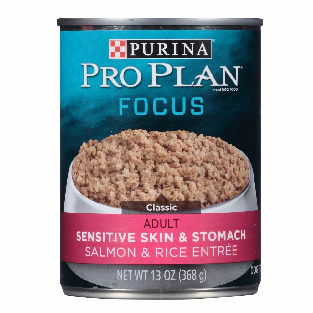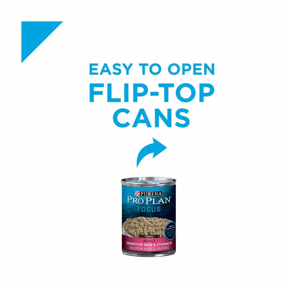 Focus on your dog’s unique nutritional needs when you offer up Purina Pro Plan FOCUS Sensitive Skin and Stomach Salmon and Rice Entree Classic adult wet dog food at feeding time. Nutrient-rich salmon serves as a protein source in this sensitive stomach dog food, and every high-quality ingredient is carefully chosen for a specific nutritional or functional purpose. We formulate this wet dog food for easy digestion, so it’s gentle on your dog’s stomach. Linoleic acid, an omega fatty acid, helps to support his healthy skin and coat, and an optimal protein to fat ratio helps him maintain an ideal body condition. The natural prebiotic fiber in this dog food for sensitive stomachs promotes digestive health to support his total well-being. Give your dog nutrition that performs when you fill his dish with this Purina Pro Plan FOCUS wet dog food every day and help him be his best with every bite.; Serve Purina Pro Plan FOCUS Sensitive Skin and Stomach Salmon and Rice Entree Classic adult wet dog food, and provide your dog with specialized nutrition. We formulate this sensitive skin dog food without wheat or soy, and without artificial colors or flavors. Real salmon helps provide the essential building blocks for the protein needs within your dog’s body so that he can maintain his active lifestyle. And natural prebiotic fiber helps promote digestive health. This super-premium wet dog food delivers 100 percent complete and balanced nutrition for adult dogs, making it a smart mealtime option for your canine companion. We recommend feeding this recipe according to the serving instructions based on his weight, and adjusting the portion size as needed to help him maintain his ideal body condition. Serve this recipe as the main course at mealtime, or combine it with Purina Pro Plan FOCUS Sensitive Skin and Stomach adult dry dog food to provide him with added variety in his daily diet. With more than 80 wet and dry dog food varieties to choose from, there’s a Purina Pro Plan recipe to meet dogs nutritional needs and personal taste preferences. Our formulas are made with high-quality ingredients, including real meat, poultry or fish, and our products are trusted and recommended by hundreds of veterinarians, breeders and rescue groups nationwide. The advanced nutrition of Purina Pro Plan is the result of more than 85 years of Purina research and is backed by over 400 scientists, including nutritionists, veterinarians and behaviorists. We proudly manufacture this recipe in our Purina-owned U.S. facilities so you know his meals are coming from a reliable brand. Our team of dedicated experts performs checks for quality and safety throughout the manufacturing process, giving your dog a safe and nutritious meal with every can of Purina Pro Plan FOCUS Sensitive Skin and Stomach Salmon and Rice Entree Classic adult wet dog food you purchase.; Treat your dog’s digestive system tenderly with Purina Pro Plan FOCUS Sensitive Skin & Stomach Salmon & Rice Entree Classic adult wet dog food. Natural prebiotic fiber supports digestive health.