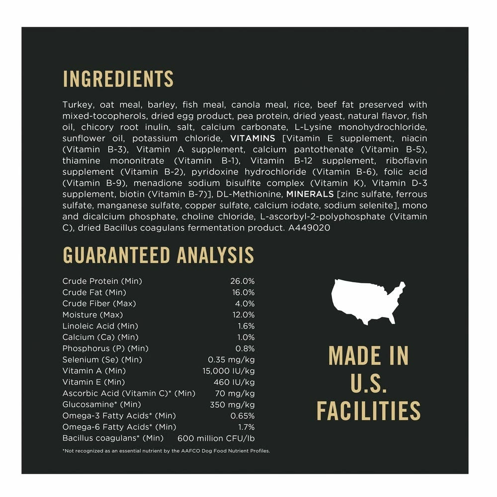 Turkey, Oat Meal, Barley, Fish Meal, Canola Meal, Rice, Beef Fat Preserved With Mixed-Tocopherols, Dried Egg Product, Pea Protein, Dried Yeast, Natural Flavor, Fish Oil, Chicory Root Inulin, Salt, Calcium Carbonate, L-Lysine Monohydrochloride, Sunflower Oil, Potassium Chloride, VITAMINS [Vitamin E Supplement, Niacin (Vitamin B-3), Vitamin A Supplement, Calcium Pantothenate (Vitamin B-5), Thiamine Mononitrate (Vitamin B-1), Vitamin B-12 Supplement, Riboflavin Supplement (Vitamin B-2), Pyridoxine Hydrochloride (Vitamin B-6), Folic Acid (Vitamin B-9), Menadione Sodium Bisulfite Complex (Vitamin K), Vitamin D-3 Supplement, Biotin (Vitamin B-7)], DL-Methionine, MINERALS [Zinc Sulfate, Ferrous Sulfate, Manganese Sulfate, Copper Sulfate, Calcium Iodate, Sodium Selenite], Mono And Dicalcium Phosphate, Choline Chloride, L-Ascorbyl-2-Polyphosphate (Vitamin C), Dried Bacillus Coagulans Fermentation Product.