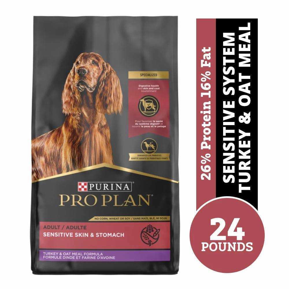 Nourish your dog’s skin and coat and help support his digestive health with Purina Pro Plan SPECIALIZED Sensitive Skin & Stomach Turkey & Oat Meal Formula adult dry dog food. Real turkey is the #1 ingredient in this wholesome, high protein dog food, and real oat meal is easy to digest and gentle on his sensitive stomach. Sunflower oil provides a rich source of omega-6 fatty acids to support his skin and coat, and omega-3 fatty acids from fish oil and glucosamine promote mobility and joint health for dogs. Our pet nutritionists fortify our sensitive stomach dog food with guaranteed live dog probiotics to support healthy digestion and include natural prebiotic fiber to promote beneficial intestinal bacteria. Highly digestible for optimal nutrient delivery, our dry dog food for skin and coat care helps your pal get the maximum benefits from every serving. Plus, antioxidants in this dog food kibble help support a healthy immune system. You can feel confident filling your dog’s bowl knowing our complete and balanced adult dog food for sensitive skin has no corn, wheat, soy, or artificial colors or flavors to meet your ingredient preferences. We produce this sensitive skin dog food with pride in Purina-owned, U.S. facilities for quality and safety.