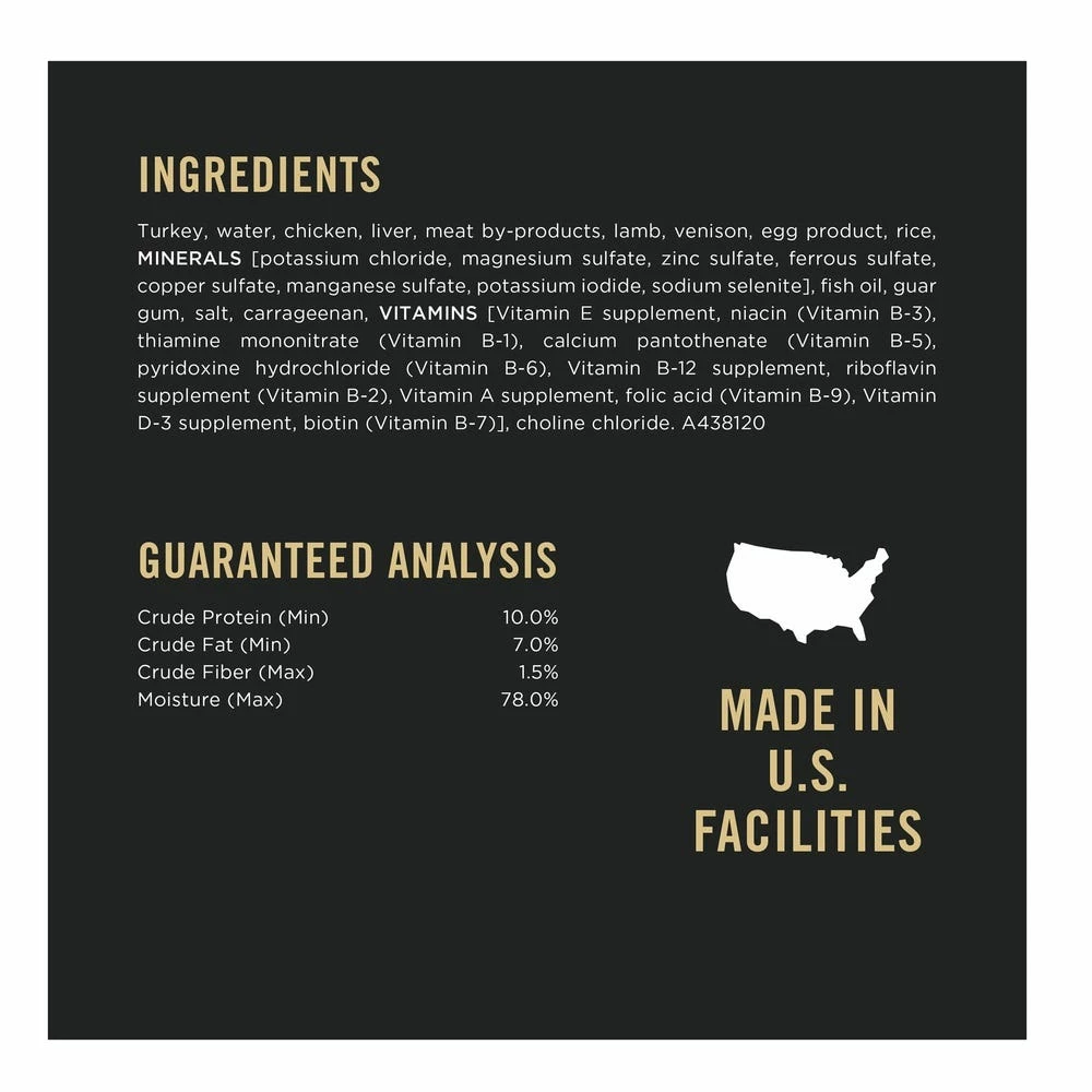 Turkey, Water, Chicken, Liver, Meat By-Products, Lamb, Venison, Egg Product, Rice, MINERALS [Potassium Chloride, Magnesium Sulfate, Zinc Sulfate, Ferrous Sulfate, Copper Sulfate, Manganese Sulfate, Potassium Iodide, Sodium Selenite], Fish Oil, Guar Gum, Salt, Carrageenan, VITAMINS [Vitamin E Supplement, Niacin (Vitamin B-3), Thiamine Mononitrate (Vitamin B-1), Calcium Pantothenate (Vitamin B-5), Pyridoxine Hydrochloride (Vitamin B-6), Vitamin B-12 Supplement, Riboflavin Supplement (Vitamin B-2), Vitamin A Supplement, Folic Acid (Vitamin B-9), Vitamin D-3 Supplement, Biotin (Vitamin B-7)], Choline Chloride.
