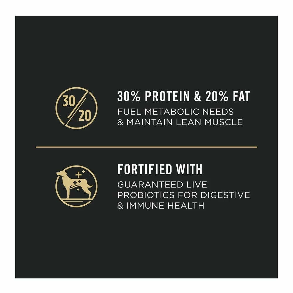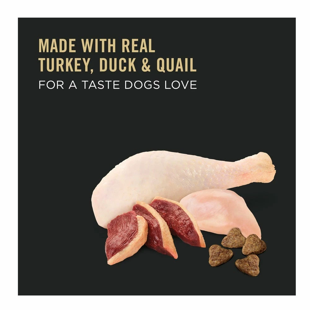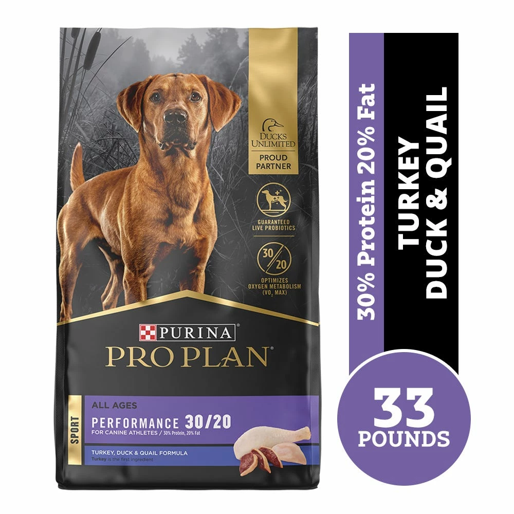 Satisfy your dog’s taste for adventure with the fine-tuned nutrition of Purina Pro Plan Sport Performance 30/20 Turkey, Duck & Quail Formula Dry Dog Food. Made for competitive canine athletes and highly active dogs alike, this sport dog food provides concentrated nutrition to help optimize oxygen metabolism for increased endurance. This triple-protein all life stages dry dog food lists real, high-quality turkey as its number one ingredient, so you can feel confident you’re giving your dog the quality food he deserves. The dog food formula contains a ratio of 30 percent protein and 20 percent fat to help your active dog maintain energy and fuel metabolic needs at any age—no matter if you have a puppy, adult or reproducing female. Made with live probiotics for digestive and immune health, this formula delivers optimized nutrition that helps your dog reach his full potential. It also supports your dog’s skin and coat health with Omega-6 fatty acids and vitamins. And because Sport Performance 30/20 formulas are made especially for hardworking dogs, like yours, it has amino acids to nourish your dog’s muscles including in the critical time directly after exercise, while EPA and glucosamine also help support joint health and mobility. This antioxidant-rich formula offers 100 percent complete and balanced nutrition, helping support your canine’s immune system. Plus, Pro Plan Sport is the official performance dog food of Ducks Unlimited, so you can feel confident in helping him achieve his full athletic potential.
