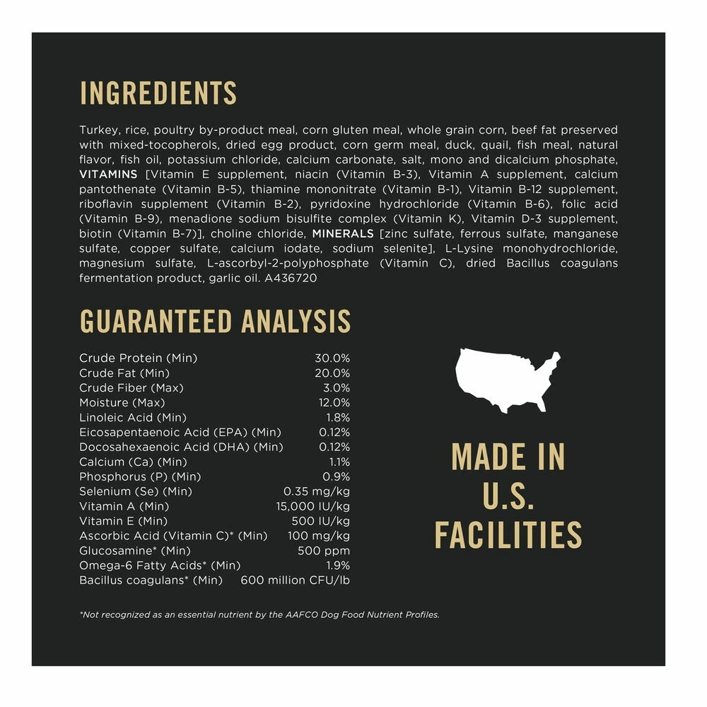 Turkey, Rice, Poultry By-Product Meal, Corn Gluten Meal, Whole Grain Corn, Beef Fat Preserved With Mixed-Tocopherols, Dried Egg Product, Corn Germ Meal, Duck, Quail , Fish Meal, Natural Flavor, Fish Oil, Potassium Chloride, Calcium Carbonate, Salt, Mono And Dicalcium Phosphate, VITAMINS [Vitamin E Supplement, Niacin (Vitamin B-3), Vitamin A Supplement, Calcium Pantothenate (Vitamin B-5), Thiamine Mononitrate (Vitamin B-1), Vitamin B-12 Supplement, Riboflavin Supplement (Vitamin B-2), Pyridoxine Hydrochloride (Vitamin B-6), Folic Acid (Vitamin B-9), Menadione Sodium Bisulfite Complex (Vitamin K), Vitamin D-3 Supplement, Biotin (Vitamin B-7)], Choline Chloride, MINERALS [Zinc Sulfate, Ferrous Sulfate, Manganese Sulfate, Copper Sulfate, Calcium Iodate, Sodium Selenite], L-Lysine Monohydrochloride, Magnesium Sulfate, L-Ascorbyl-2-Polyphosphate (Vitamin C), Dried Bacillus Coagulans Fermentation Product, Garlic Oil.