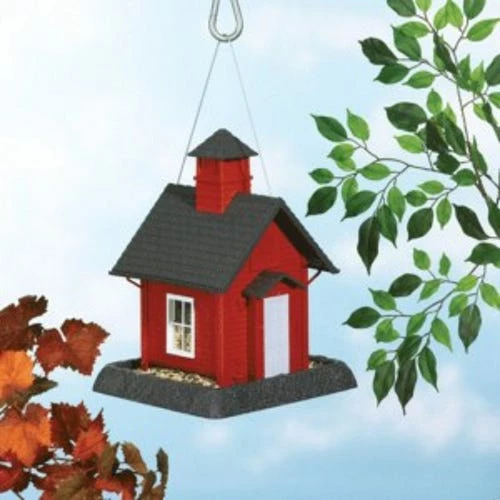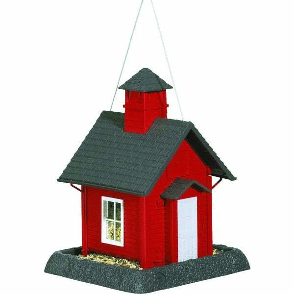 - School house-themed bird feeder is made of plastic for easy cleaning.