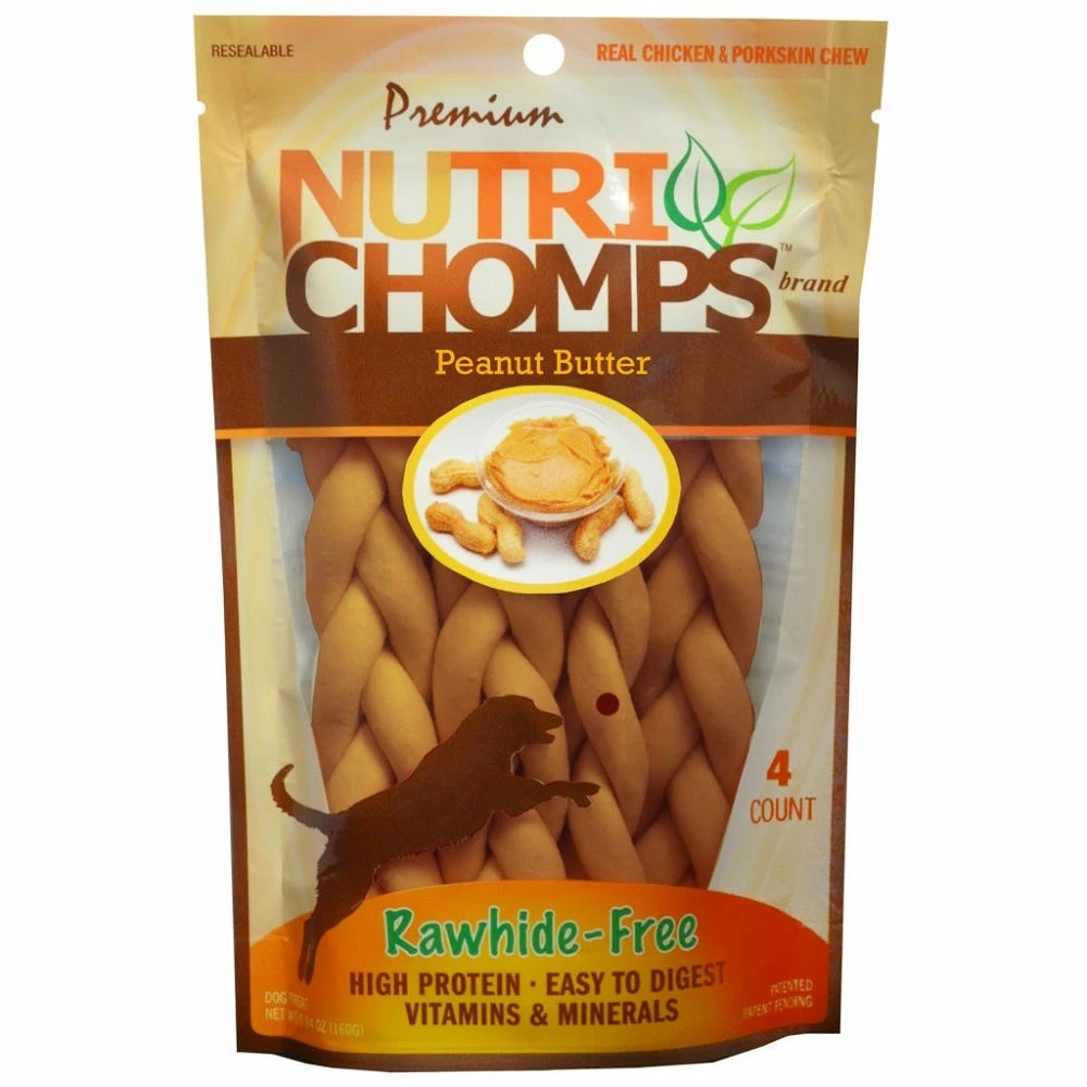 Premium NutriChomps 6” Peanut Butter Braids are rawhide-free and naturally delicious. These premium chews are made with real chicken and pork skin along with real milk for a high-protein, high fiber, and low carb treat that’s easy to digest. NutriChomps help promote good dental health between brushings by scraping away plaque and tartar as dogs chew. For even more healthy rewards, NutriChomps have no artificial flavors or dyes and are vitamin and mineral enriched to support a variety of internal systems to keep your fur friend looking and feeling their best. Perfect for Small, Medium, and Large Dogs.