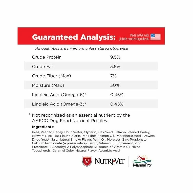 Pea Flour, Pearled Barley Flour, Water, Glycerin, Pearled Barley, Brewers Rice, Salmon, Gelatin, Oat Flour, Pea Fiber, Salmon Oil, Flax Seed, Phosphoric Acid, Brewers Dried Yeast, Lecithin, Salt, Natural Smoke Flavor, Molasses, Calcium Propionate, Garlic, Vitamin E Supplement, Zinc Proteinate, Ascorbic Acid (a Source of Vitamin C), Mixed Tocopherols (a Preservative), Caramel Color, Natural Flavor.