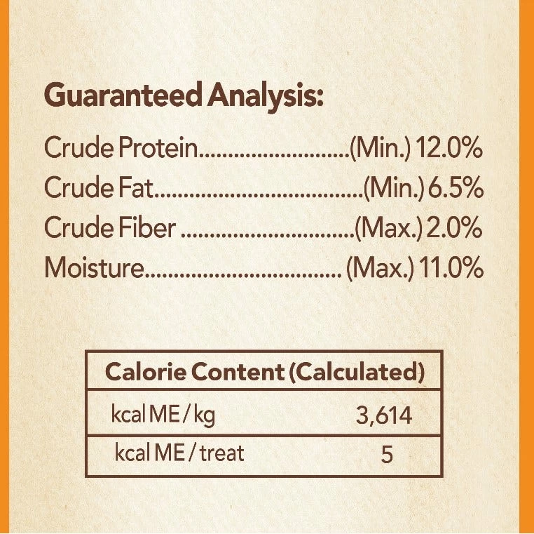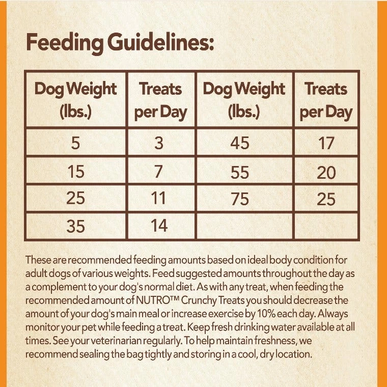 These are the recommended feeding amounts based on an ideal body condition for adult dogs of various weights. Feed suggested amounts throughout the day as a complement to your dog’s normal diet. As with any treat, when feeding the recommended amount of NUTRO™ Crunchy Treats, you should decrease the amount of your dog’s main meal or increase exercise by 10 percent each day. Always monitor your pet while feeding a treat. Keep fresh drinking water available at all times. See your veterinarian regularly. To help maintain freshness, we recommend sealing the bag tightly and storing it in a cool, dry location.
