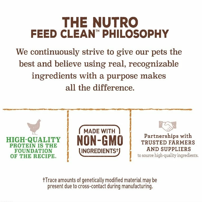 - NUTRO Crunchy Treats dog biscuits are made with non-GMO ingredients*, and contain: NO chicken by-product meal, NO artificial flavors or colors, NO artificial preservatives, NO corn, wheat, or soy protein. * Trace amounts of genetically modified material may be present due to cross contact during manufacturing