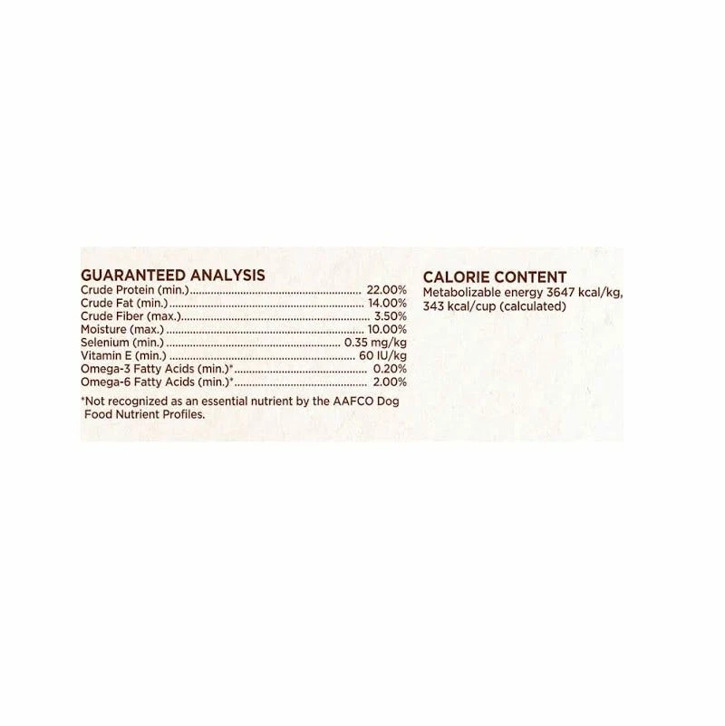 These are the recommended feeding amounts based on the ideal body condition for adult dogs of various weights. Individual dogs’ energy requirements may differ. Adjust the amount fed to obtain or maintain your dog’s optimum weight. Keep fresh drinking water available at all times, provide plenty of exercise and see your veterinarian regularly. Serve dry or lightly moistened. Every cup of our food is nutrient dense so your dog gets the right amount of calories in a complete and nutritious meal.To help maintain freshness, seal bag tightly and store in a cool, dry location.