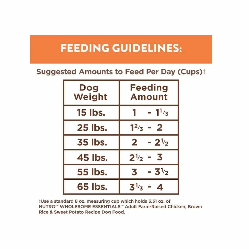 Use a standard 8 oz. measuring cup which holds 3.11 oz. of NUTRO™ NATURAL CHOICE™ Large Breed Adult Lamb & Brown Rice Recipe Dog Food.