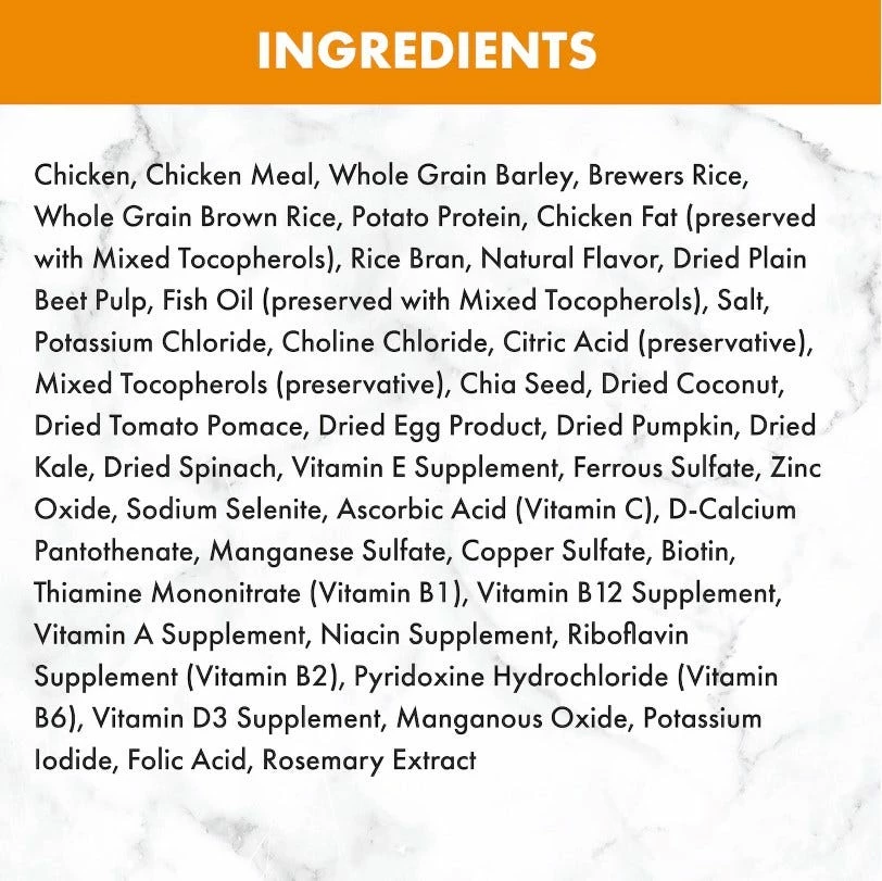 Chicken, Chicken Meal, Whole Grain Barley, Split Peas, Brewers Rice, Whole Grain Brown Rice, Chicken Fat (preserved with Mixed Tocopherols), Natural Flavor, Rice Bran, Whole Grain Oatmeal, Whole Flaxseed, Dried Plain Beet Pulp, Potassium Chloride, Choline Chloride, Citric Acid (preservative), Mixed Tocopherols (preservative), Chia seed, Dried Coconut, DL-Methionine, Dried Tomato Pomace, Dried Egg Product, Dried Pumpkin, Dried Kale, Dried Spinach, Salt, Vitamin E Supplement, Ferrous Sulfate, Zinc Oxide, Sodium Selenite, Asorbic Acid (Vitamin C), Manganese Sulfate, Copper Sulfate, D-Calcium Sulfate, Biotin, Thiamine Mononitrate (Vitamin B1), Vitamin B12 Supplement, Vitamin A Supplement, Pyridoxide Hydrochloride (Vitamin B6), Vitamin D3 Supplement, Manganous Oxide, Potassium lodide, Folic Acid, Rosemary Extract.