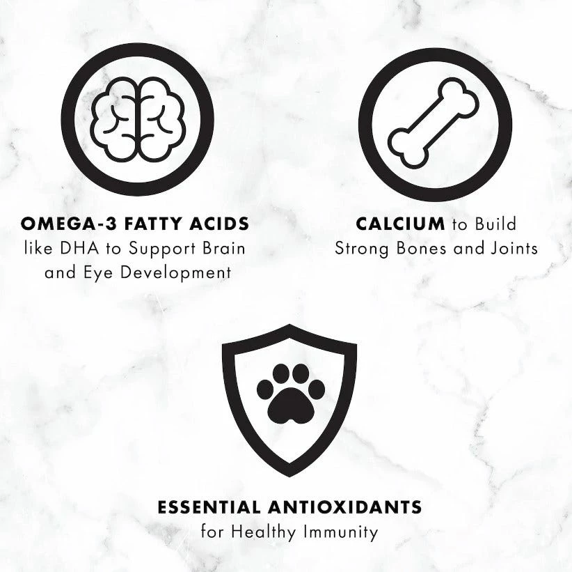 - Supports brain and eye development in puppies with omega-3 fatty acids like DHA