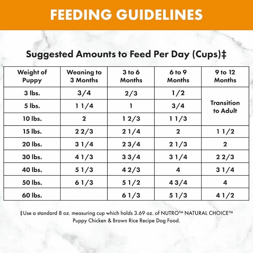 Use a standard 8 oz. measuring cup which holds 3.11 oz. of NUTRO™ NATURAL CHOICE™ Large Breed Adult Lamb & Brown Rice Recipe Dog Food.