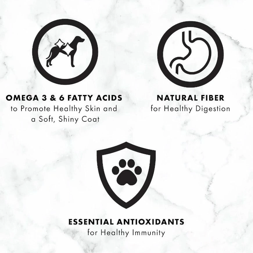 - Omega-3 and omega-6 fatty acids to promote healthy skin and a soft, shiny coat