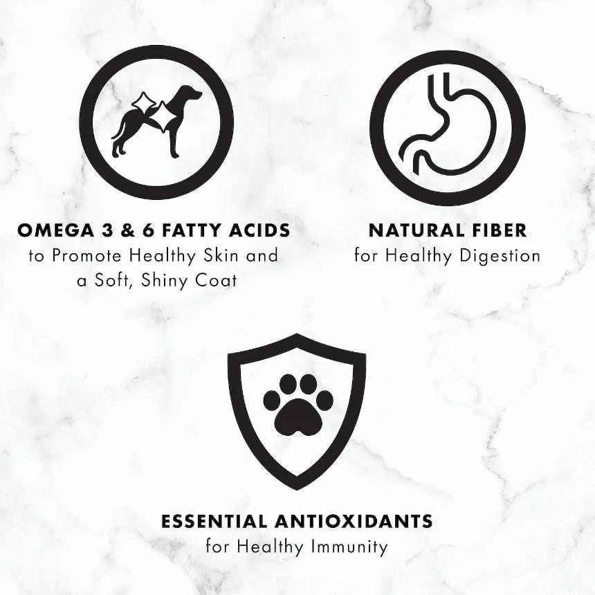 - Omega-3 and omega-6 fatty acids to promote healthy skin and a soft, shiny coat