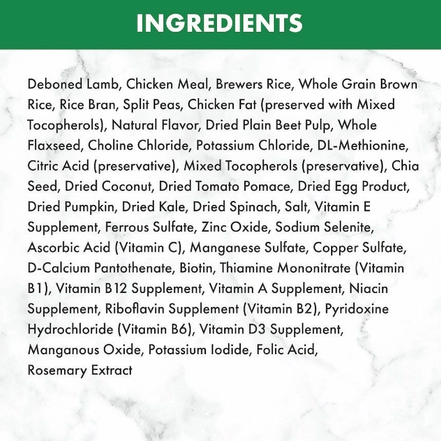 Deboned Lamb, Chicken Meal, Brewers Rice, Whole Grain Brown Rice, Rice Bran, Split Peas, Chicken Fat (preserved with Mixed Tocopherols), Natural Flavor, Dried Plain Beet Pulp, Whole Flaxseed, Choline Chloride, Potassium Chloride, DL-Methionine, Citric Acid (preservative), Mixed Tocopherols (preservative), Chia Seed, Dried Coconut, Dried Tomato Pomace, Dried Egg Product, Dried Pumpkin, Dried Kale, Dried Spinach, Salt, Vitamin E Supplement, Ferrous Sulfate, Zinc Oxide, Sodium Selenite, Ascorbic Acid (Vitamin C), Manganese Sulfate, Copper Sulfate, D-Calcium Pantothenate, Biotin, Thiamine Mononitrate (Vitamin B1), Vitamin B12 Supplement, Vitamin A Supplement, Niacin Supplement, Riboflavin Supplement (Vitamin B2), Pyridoxine Hydrochloride (Vitamin B6), Vitamin D3 Supplement, Manganous Oxide, Potassium Iodide, Folic Acid, Rosemary Extract.