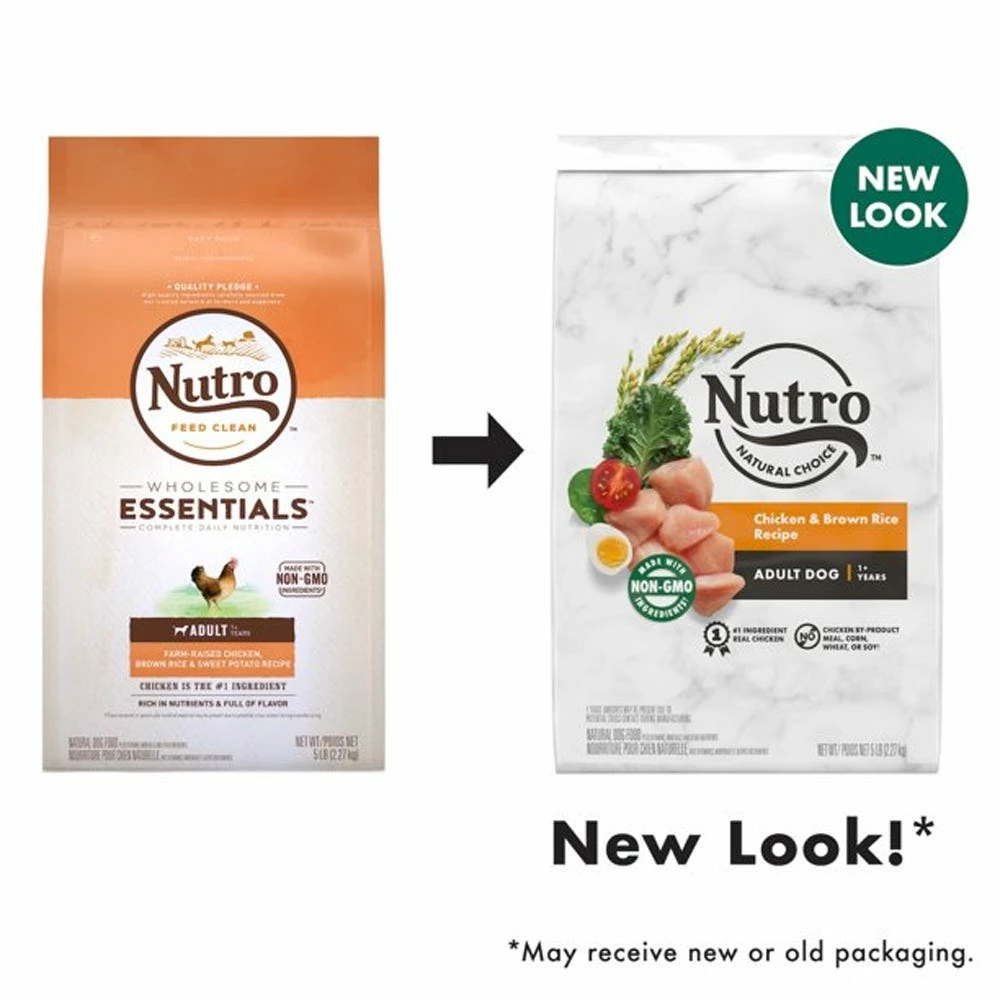 - Contains one (1) 5-lb. bag of NUTRO WHOLESOME ESSENTIALS Farm-Raised Chicken, Brown Rice & Sweet Potato Recipe Adult Dry Dog Food