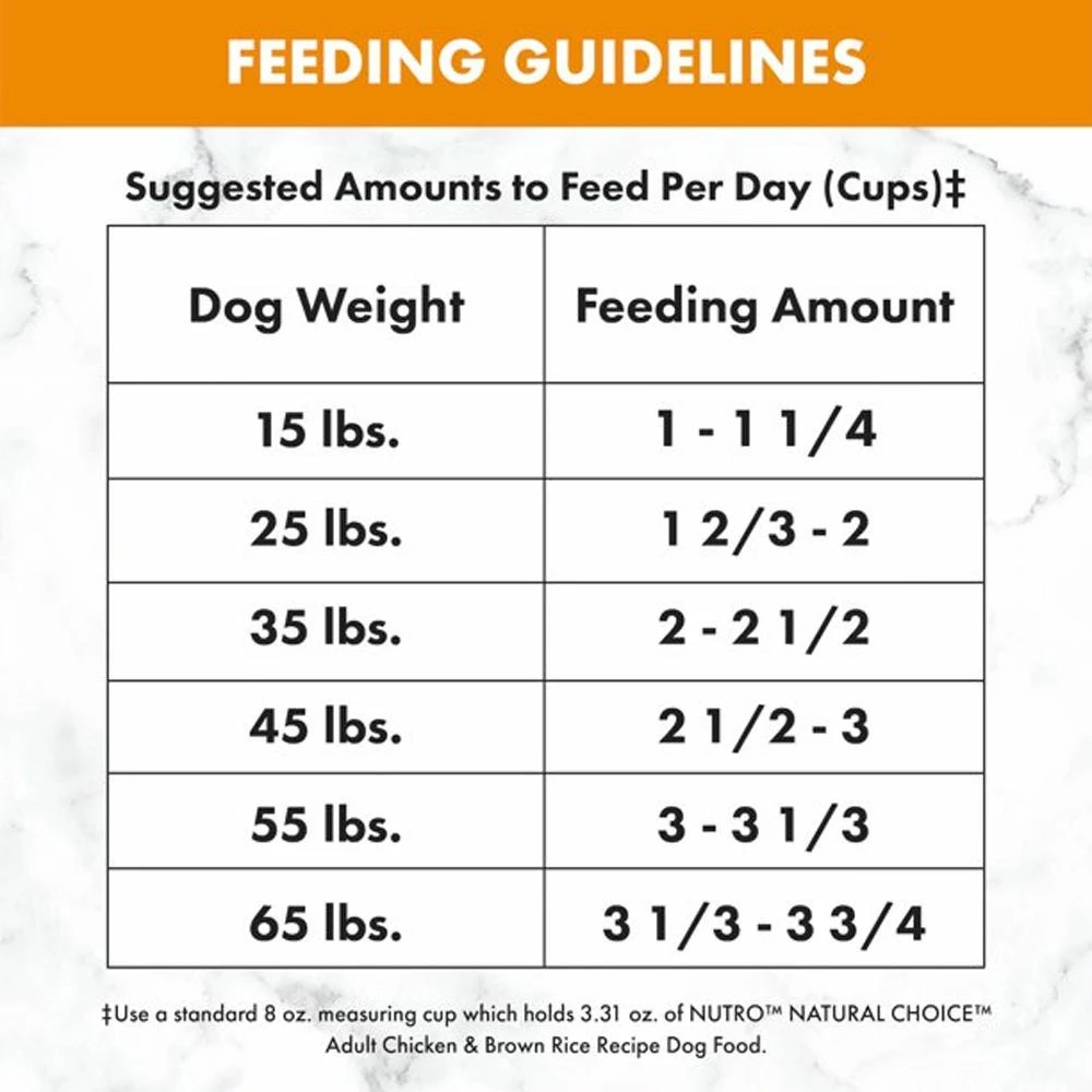 ‡Use a standard 250 ml measuring cup which holds 94 g of NUTRO™ NATURAL CHOICE™ Adult Chicken & Brown Rice Recipe Dog Food.