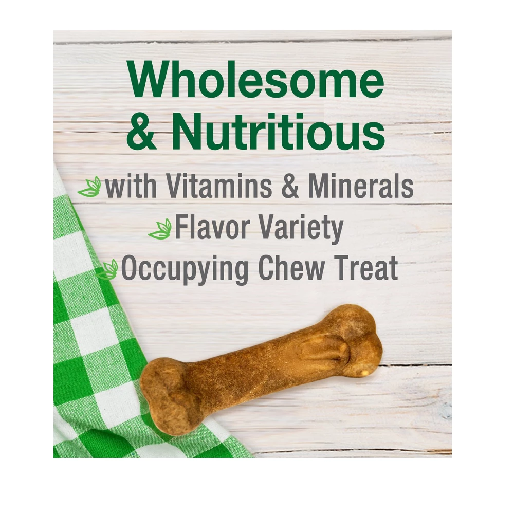 Wheat Starch, Vegetable Glycerin, Potato Starch, Pea Protein, Natural Flavor, Rice Flour, Powdered Cellulose, Lecithin, Oat Hulls, Calcium Carbonate, Natural Bacon Flavor, Natural Roast Beef Flavor, Dried Chicken, Choline Chloride, Thiamine Mononitrate, Riboflavin Supplement, Niacin Supplement, Calcium Pantothenate, Folic Acid, Vitamin A Supplement, Vitamin E Supplement, Biotin, Inositol, Ferrous Carbonate, Magnesium Oxide, Dicalcium Phosphate, Potassium Chloride, Sodium Selenite, Calcium Chloride, Zinc Oxide, Copper Oxide, Manganous Oxide, and Sodium Molybdate.