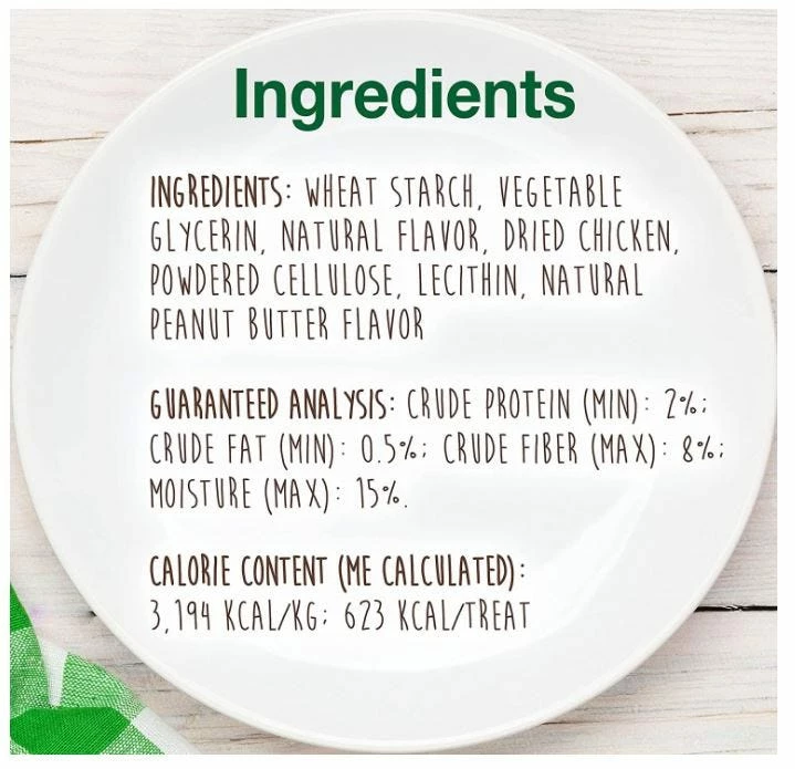 Wheat Starch, Vegetable Glycerin, Natural Flavor, Dried Chicken, Powdered Cellulose, Lecithin, Natural Peanut Butter Flavor