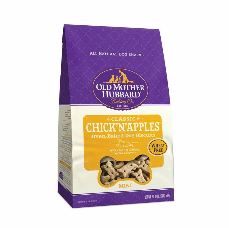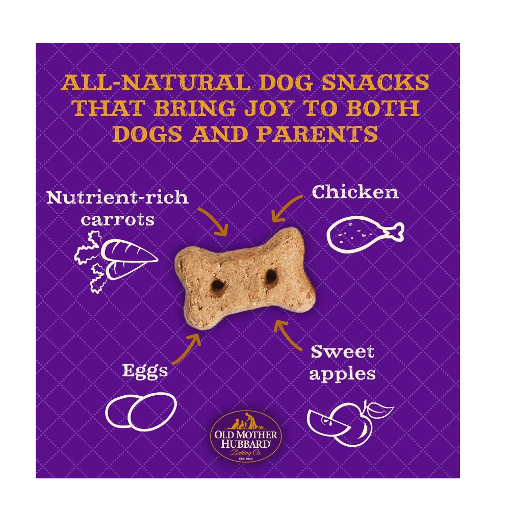 Ingredients: Ground Barley, Ground Brown Rice, Chicken, Apples, Chicken Meal, Chicken Fat, Cane Molasses, Eggs, Carrots, Turmeric, Salt, Mixed Tocopherols added to preserve freshness, Rosemary Extract, Green Tea Extract, Spearmint Extract. Old Mother Hubbard Dog Snacks are intended for intermittent or supplemental feeding only.