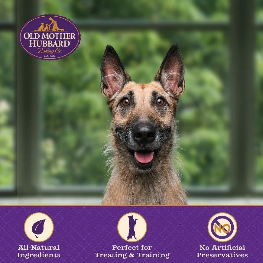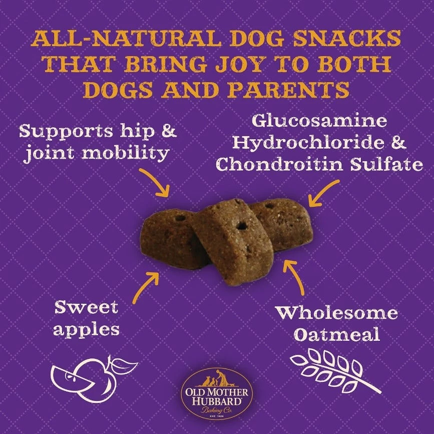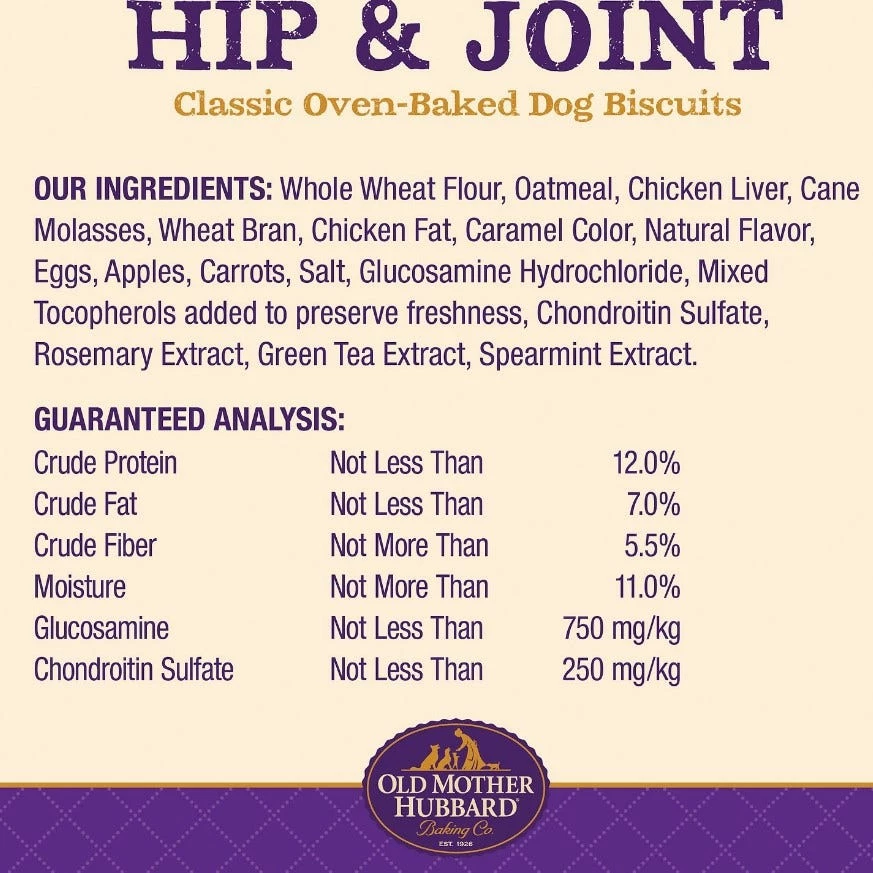 Ingredients: Whole Wheat Flour, Oatmeal, Chicken Liver, Cane Molasses, Wheat Bran, Chicken Fat, Caramel Color, Natural Flavor, Eggs, Apples, Carrots, Salt, Glucosamine Hydrochloride, Mixed Tocopherols added to preserve freshness, Chondroitin Sulfate, Rosemary Extract, Green Tea Extract, Spearmint Extract.v  Guaranteed Analysis: Caloric Content: 3345 kcal/kg  Feeding Guide: Old Mother Hubbard Dog Snacks are intended for intermittent or supplemental feeding only.