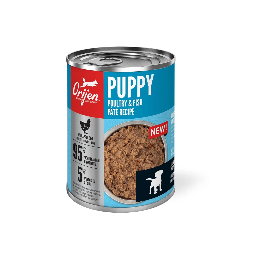 ORIJEN Puppy Poultry & Fish Pate Recipe nourishes as nature intended with rich inclusions of poultry and fish that will help your puppy grow up strong and thrive. Packed with 95%* premium animal ingredients, the first five ingredients in ORIJEN Puppy Poultry & Fish Pate are fresh or raw animal ingredients including chicken and turkey. This includes succulent WholePrey ingredients like organs and bone to add a source of essential vitamins, minerals and amino acids. Feed your puppy ORIJEN Puppy Poultry & Fish Pate alone to add moisture and nourishment to their diet, or add it on top of ORIJEN Puppy or Puppy Large kibble for a nutritious, indulgent treat at mealtime.