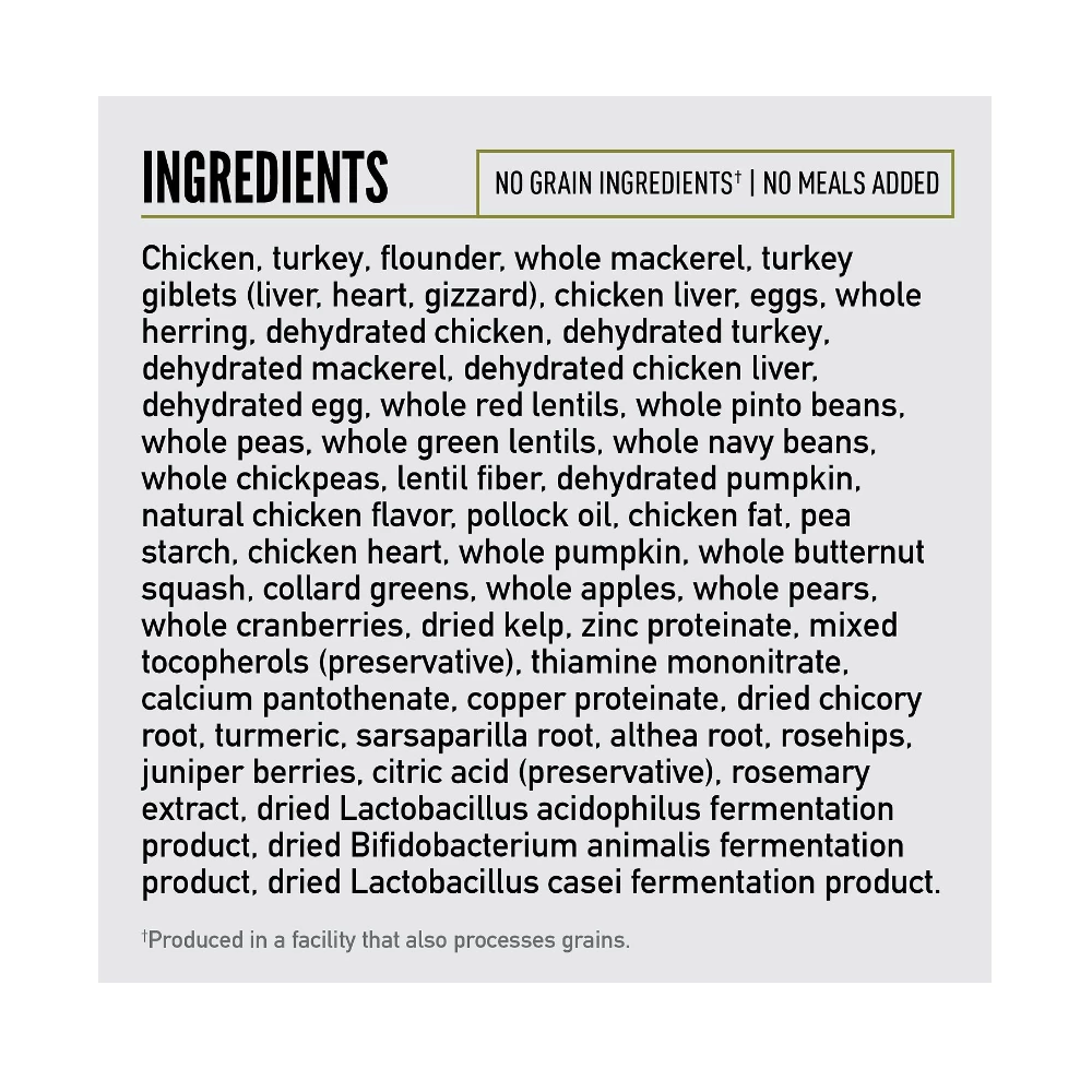 Chicken, Turkey, Flounder, Whole Mackerel, Turkey Giblets (Liver, Heart, Gizzard), Chicken Liver, Eggs, Whole Herring, Dehydrated Chicken, Dehydrated Turkey, Dehydrated Mackerel, Dehydrated Chicken Liver, Dehydrated Egg, Whole Red Lentils, Whole Pinto Beans, Whole Peas, Whole Green Lentils, Whole Navy Beans, Whole Chickpeas, Lentil Fiber, Dehydrated Pumpkin, Natural Chicken Flavor, Pollock Oil, Chicken Fat, Pea Starch, Chicken Heart, Whole Pumpkin, Whole Butternut Squash, Collard Greens, Whole Apples, Whole Pears, Whole Cranberries, Dried Kelp, Zinc Proteinate, Mixed Tocopherols (Preservative), Thiamine Mononitrate, Calcium Pantothenate, Copper Proteinate, Dried Chicory Root, Turmeric, Sarsaparilla Root, Althea Root, Rosehips, Juniper Berries, Citric Acid (Preservative), Rosemary Extract, Dried Lactobacillus Acidophilus Fermentation Product, Dried Bifidobacterium Animalis Fermentation Product, Dried Lactobacillus Casei Fermentation Product.