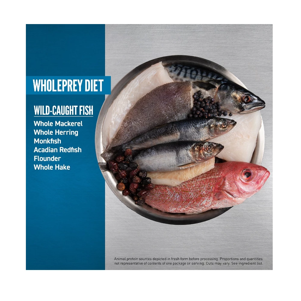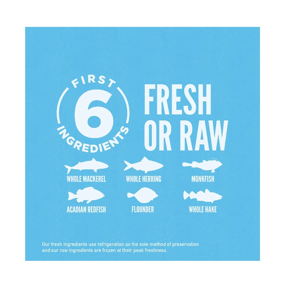 Whole Mackerel, Whole Herring, Monkfish, Acadian Redfish, Flounder, Whole Hake, Mackerel Meal, Herring Meal, Blue Whiting Meal, Pollock Meal, Whole Red Lentils, Whole Pinto Beans, Sa Ower Oil, Whole Peas, Whole Green Lentils, Whole Navy Beans, Sunflower Oil, Lentil Fiber, Natural Fish Flavor, Whole Chickpeas, Pea Starch, Herring Oil, Vitamin E Supplement, Mixed Tocopherols (Preservative), Whole Pumpkin, Whole Butternut Squash, Collard Greens, Whole Apples, Whole Pears, Dried Kelp, Zinc Proteinate, Calcium Pantothenate, Thiamine Mononitrate, Copper Proteinate, Dried Chicory Root, Turmeric, Sarsaparilla Root, Althea Root, Rosehips, Juniper Berries, Citric Acid (Preservative), Rosemary Extract, Dried Lactobacillus Acidophilus Fermentation Product, Dried Bifidobacterium Animalis Fermentation Product, Dried Lactobacillus Casei Fermentation Product.