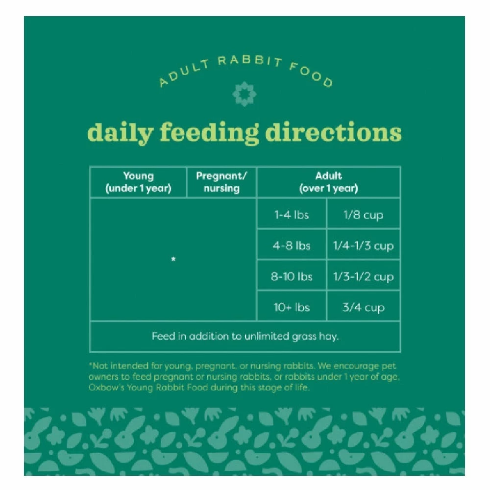 Mature Rabbits (over 1 year) 1-4 lbs = 1/8 cup daily 4-8 lbs = 1/4-1/3 cup daily 8-10 lbs = 1/3-1/2 cup daily 10 lbs+ = 3/4 cup daily Feed in addition to unlimited grass hay. Transitioning to a New Food: Week 1, mix 3 parts current food with 1 part new food. Week 2, mix 2 parts current food with 2 parts new food. Week 3, mix 1 part current food with 3 parts new food. Week four, feed Simple Harvest – Adult Rabbit exclusively. *Please note that these are guidelines. If your rabbit is overweight or underweight, please contact your veterinarian or Oxbow for more specific feeding information.