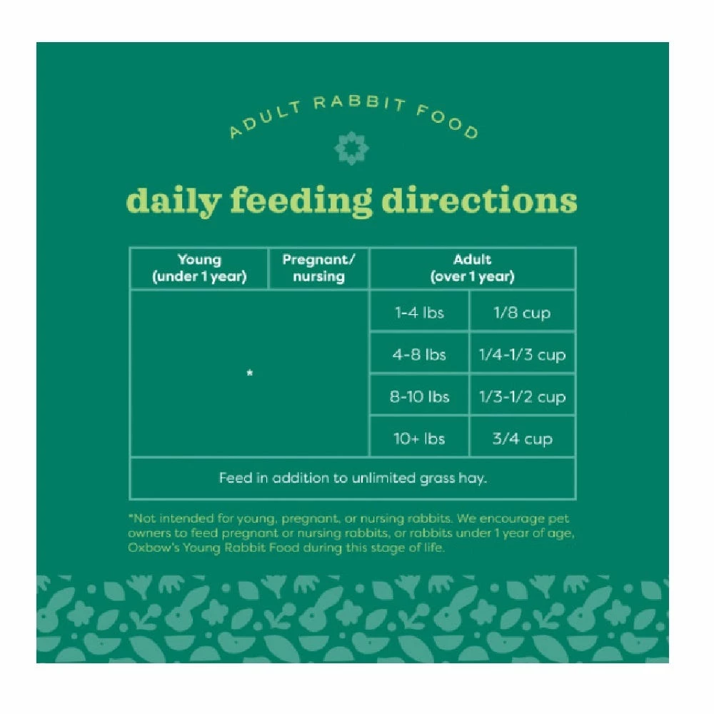 Mature Rabbits (over 1 year) 1-4 lbs. = 1/8 cup daily 4-8 lbs. = 1/4-1/3 cup daily 8-10 lbs. = 1/3-1/2 cup daily 10 lbs.+ = 3/4 cup daily Feed in addition to unlimited grass hay. Transitioning to a New Food: Week 1, mix 3 parts current food with 1 part new food. Week 2, mix 2 parts current food with 2 parts new food. Week 3, mix 1 part current food with 3 parts new food. Week four, feed Simple Harvest – Adult Rabbit exclusively. *Please note that these are guidelines. If your rabbit is overweight or underweight, please contact your veterinarian or Oxbow for more specific feeding information.