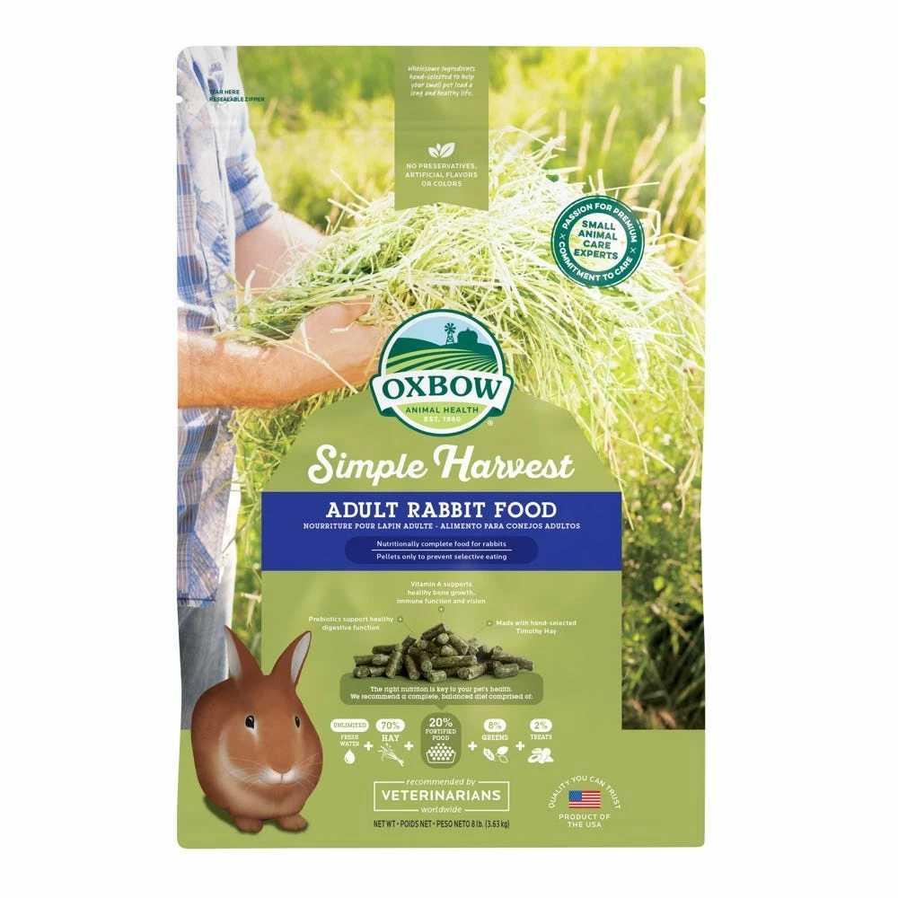 Oxbow’s Simple Harvest Adult Rabbit Food is formulated to nourish your pet the way Mother Nature intended. We begin with hand-selected Timothy Hay for effective digestion and add wholesome ingredients and vital nutrients to support daily function and performance. In the bag, and beyond, we promise only the best for your pet.