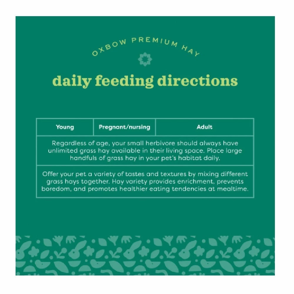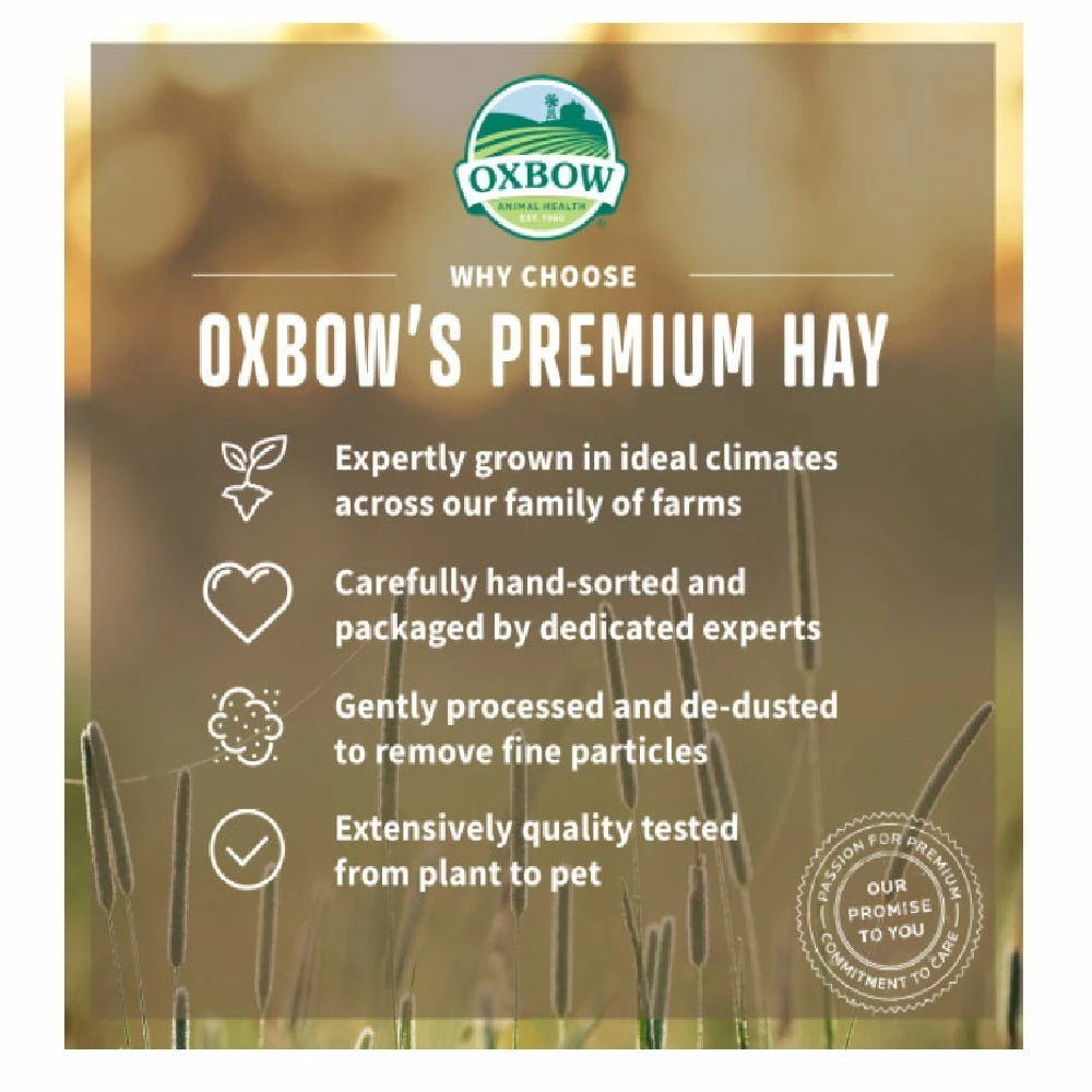 Farm-fresh and full of goodness. Oxbow’s all-natural Timothy Meadow Hay is a flavorful, enriching combination of premium grass hays – fresh from our family of farms. All Oxbow hays are hand-selected and hand-sorted, ensuring that your pet receives the very best that Mother Nature has to offer.