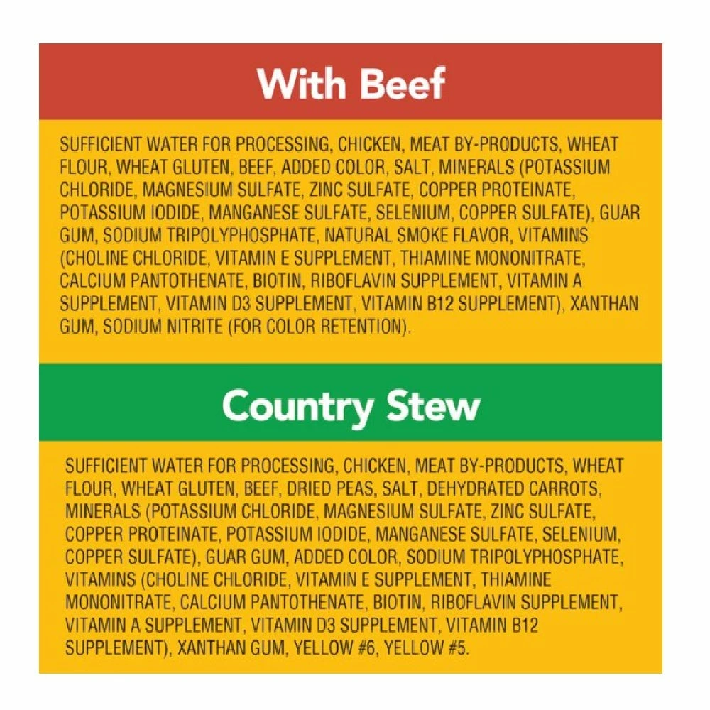 Sufficient Water For Processing, Chicken, Meat By-Products, Wheat Flour, Wheat Gluten, Beef, Dried Peas, Salt, Dehydrated Carrots, Minerals (Potassium Chloride, Magnesium Sulfate, Zinc Sulfate, Copper Proteinate, Potassium Iodide, Manganese Sulfate, Selenium, Copper Sulfate), Guar Gum, Added Color, Sodium Tripolyphosphate, Vitamins (Choline Chloride, Vitamin E Supplement, Thiamine Mononitrate, Calcium Pantothenate, Biotin, Riboflavin Supplement, Vitamin A Supplement, Vitamin D3 Supplement, Vitamin B12 Supplement), Xanthan Gum, Yellow #6, Yellow #5.