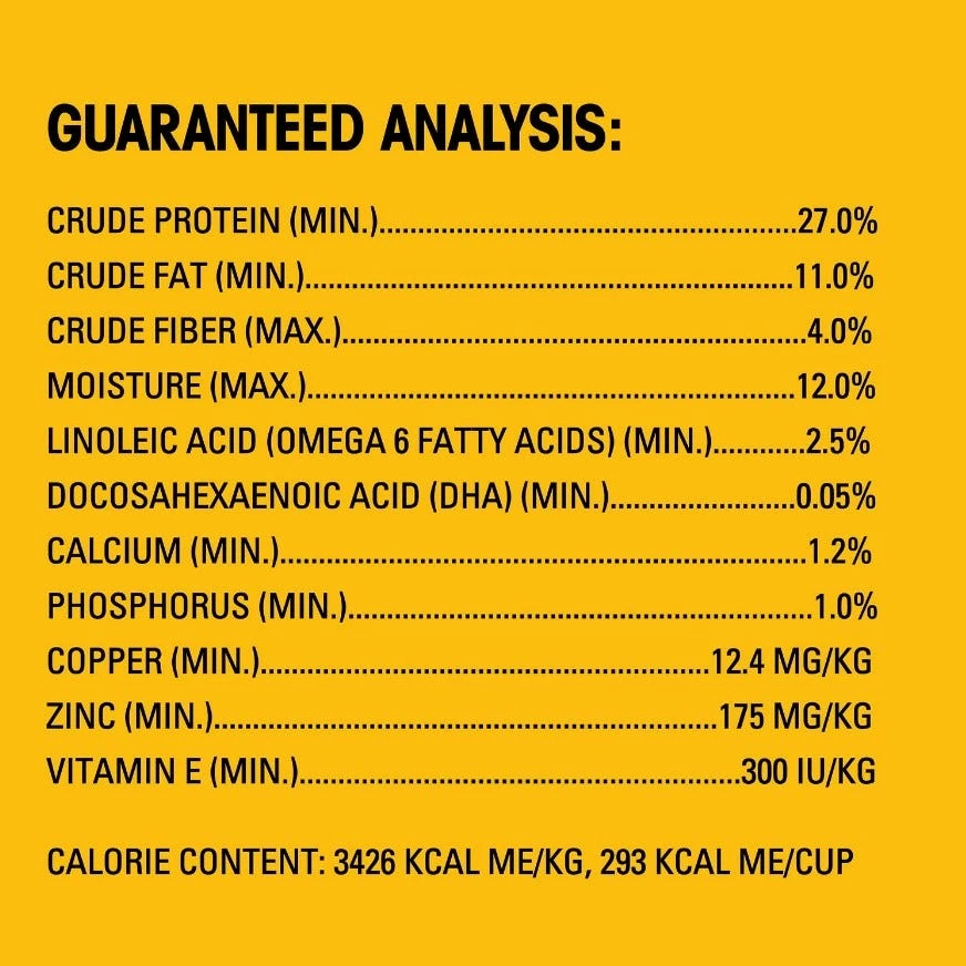 Ground Whole Grain Corn, Chicken By-Product Meal, Corn Gluten Meal, Soybean Meal, Meat and Bone Meal (source of Calcium), Animal Fat (source of Omega 6 Fatty Acids [preserved with BHA and Citric Acid]), Ground Whole Grain Wheat, Brewers Rice, Natural Flavor, Salt, Monocalcium Phosphate, Fish Oil ([source of DHA] preserved with mixed Tocopherols), Brewers Dried Yeast, Calcium Carbonate, Potassium Chloride, Choline Chloride, Dried Peas, Vitamin E Supplement, Zinc Sulfate, BHA and Citric Acid (a preservative), Niacin, Yellow 5, Yellow 6, Dried Carrots, Blue 2, Red 40, D-Calcium Pantothenate, Copper Sulfate, Riboflavin Supplement (Vitamin B2), Sodium Selenite, Pyridoxine Hydrochloride (Vitamin B6), Potassium Iodide, Vitamin A Supplement, Thiamine Mononitrate (Vitamin B1), Folic Acid, Biotin, Vitamin D3 Supplement, Vitamin B12 Supplement