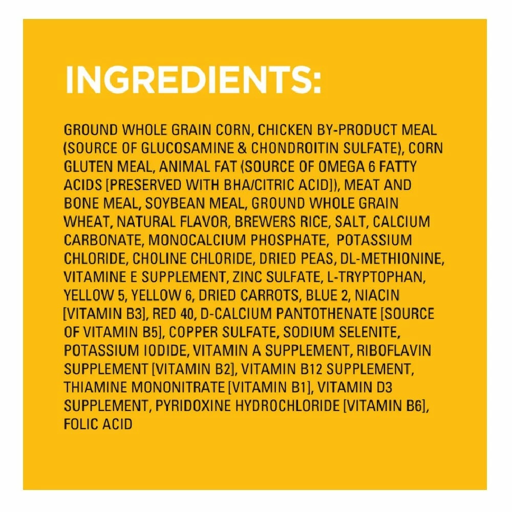 Ground Whole Grain Corn, Chicken By-Product Meal (Source Of Glucosamine & Chondroitin Sulfate), Corn Gluten Meal, Animal Fat (Source Of Omega 6 Fatty Acids [Preserved With BHA/Citric Acid]), Meat And Bone Meal, Soybean Meal, Ground Whole Grain Wheat, Natural Flavor, Brewers Rice, Salt, Calcium Carbonate, Monocalcium Phosphate, Potassium Chloride, Choline Chloride, Dried Peas, Dl-Methionine, Vitamin E Supplement, Zinc Sulfate, L-Tryptophan, Yellow 5, Yellow 6, Dried Carrots, Blue 2, Niacin [Vitamin B3], Red 40, D-Calcium Pantothenate [Source Of Vitamin B5], Copper Sulfate, Sodium Selenite, Potassium Iodide, Vitamin A Supplement, Riboflavin Supplement [Vitamin B2], Vitamin B12 Supplement, Thiamine Mononitrate [Vitamin B1], Vitamin D3 Supplement, Pyridoxine Hydrochloride [Vitamin B6], Folic Acid.