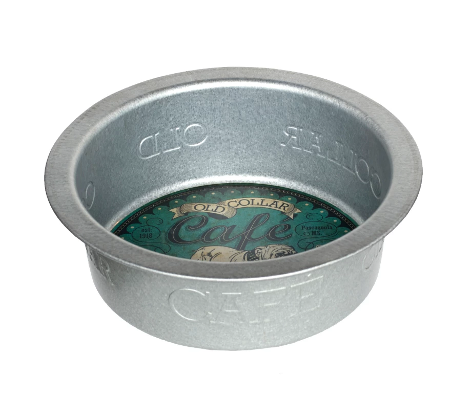 Features unique Old Collar Café bulldog design, Stamped galvanized steel puts off vintage vibe, Feeding bowl can hold up to 3 quarts for larger breeds, Extremely durable dog bowl suitable for indoor or outdoor use