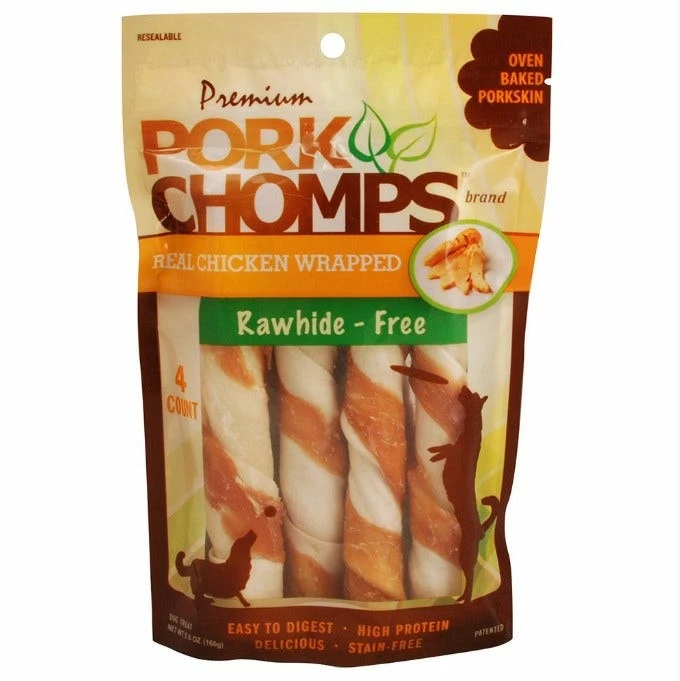Premium Pork Chomps 6” Real Chicken Wrapped Twists are 100% rawhide-free dog chews. Assorted Twists are pork skin dog treats. Veterinary Recommended Premium Pork Chomps are safe and healthy rawhide alternative dog bones. In 2012, The University of Illinois College of Veterinary Science conducted a study which proved pork skin to be fully digestible and significantly more digestible than beef rawhide. Jungle Jack Hanna has endorsed the Premium Pork Chomps brand as a safe and healthy rawhide alternative. 6” Real Chicken Wrapped Twists are perfect for Small Dogs, Medium Dogs, and Large Dogs. #DT907V, 4 count