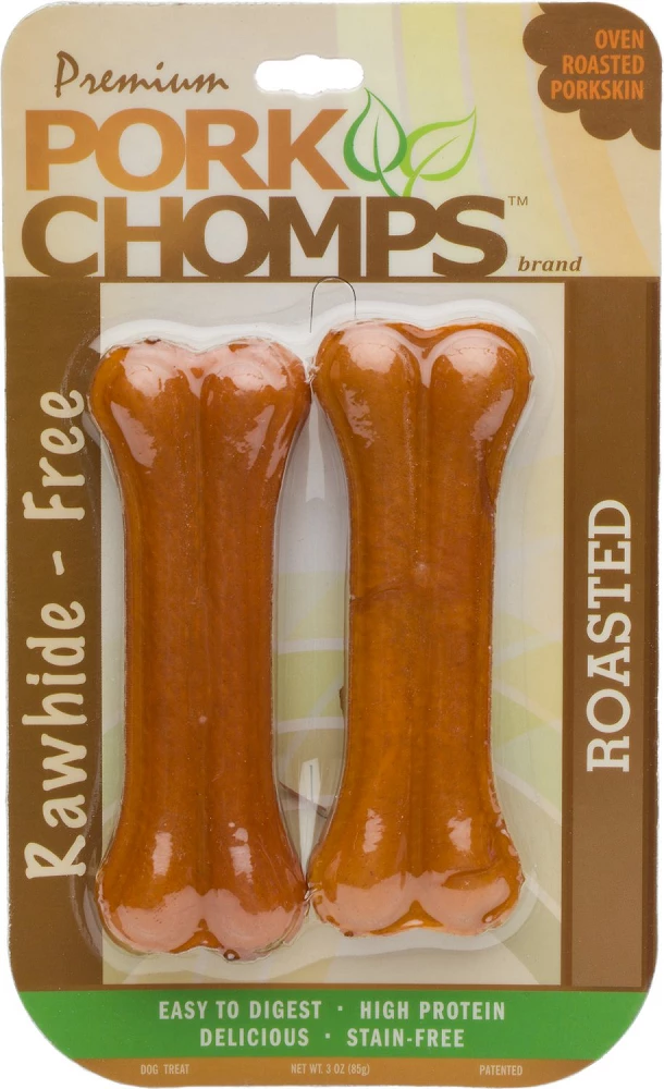 Prok Chomps Roasted pork flavored dog chew. These dog bones are rawhide free & won’t stain carpet.Â