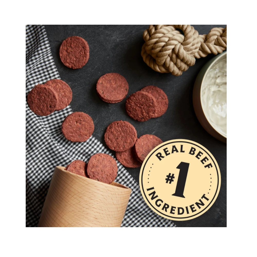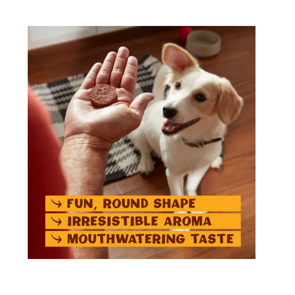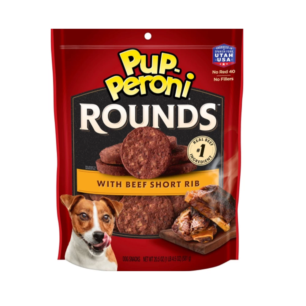 Pup-Peroni Rounds Beef Short Rib Dog Treats are a great way to give your dog more of the meaty flavor he loves! Made with real beef as the number one ingredient, these soft and chewy dog treats are a paw-fect reward for good behavior or an exciting anytime snack. Their irresistible aroma and mouthwatering taste will have your furry friend rolling over backwards for more! And because they’re made with no artificial flavors, fillers, red 40 or added grains, you can feel confident that these dog snacks are worthy of your best friend.