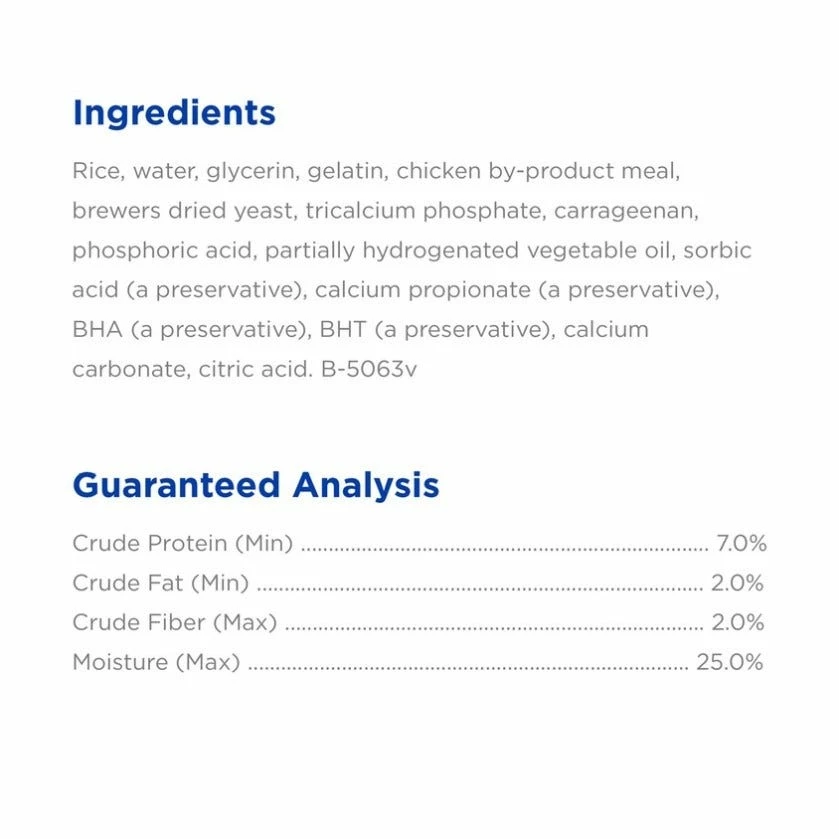 Rice, Water, Glycerin, Gelatin, Chicken By-Product Meal, Brewers Dried Yeast, Tricalcium Phosphate, Carrageenan, Phosphoric Acid, Partially Hydrogenated Vegetable Oil, Sorbic Acid (a Preservative), Calcium Propionate (a Preservative), BHA (a Preservative), BHT (a Preservative), Calcium Carbonate, Citric Acid.