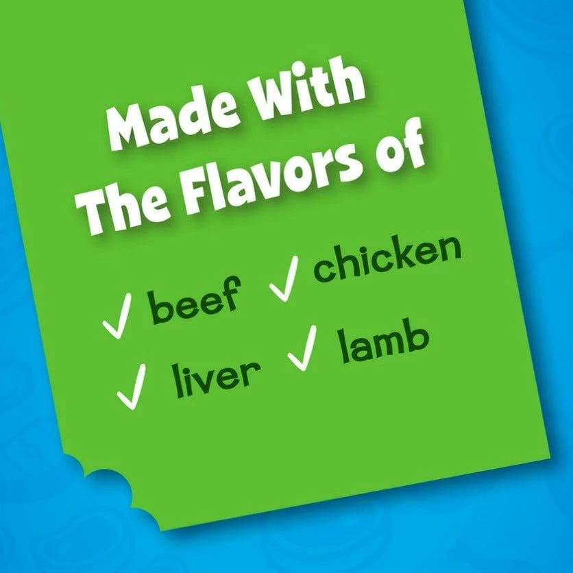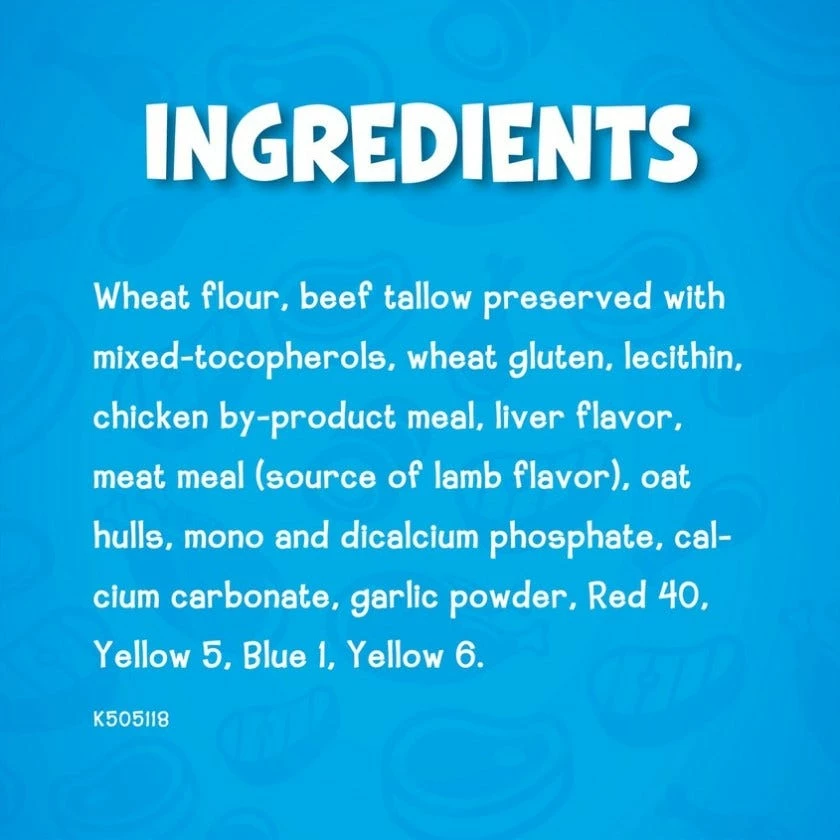 Wheat Flour, Beef Tallow Preserved with Mixed-Tocopherols, Wheat Gluten, Lecithin, Chicken By-Product Meal, Animal Digest (Source of Liver Flavor), Lamb Meal, Oat Fiber, Mono and Dicalcium Phosphate, Calcium Carbonate, Garlic Powder, Red 40, Yellow 5, Blue 1, Yellow 6.