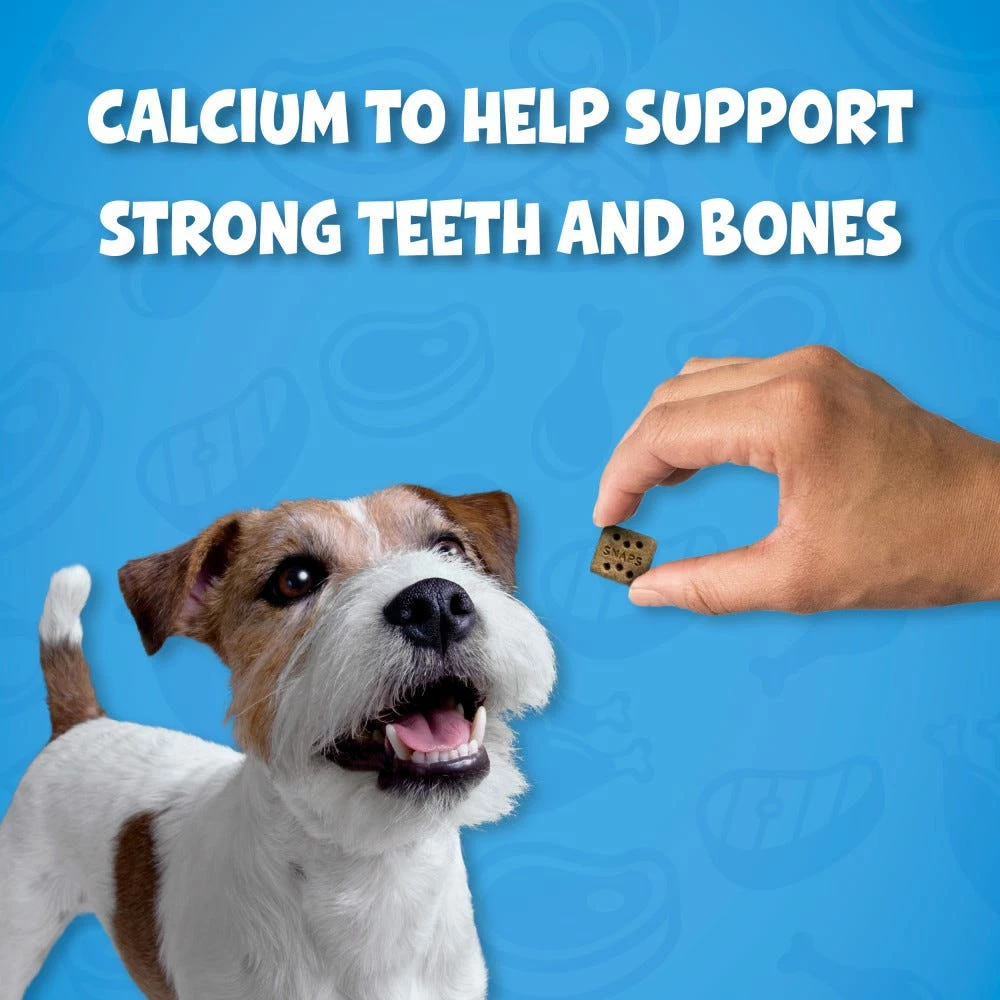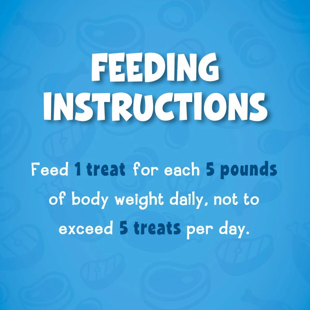 Feed as a treat to your adult dog. This product is a treat and is not intended to be fed as a meal. Feed 1 treat for each 5 pounds of body weight daily, not to exceed 5 treats per day. The caloric intake from treats should not exceed 10% of a dog’s total daily caloric requirement. If treats are given, the amount of food should be reduced accordingly. Break into pieces for adult small/toy breed dogs. Monitor your dog to ensure treat is adequately chewed prior to swallowing. Provide adequate fresh water in a clean container daily. For your pet’s health, see your veterinarian regularly.