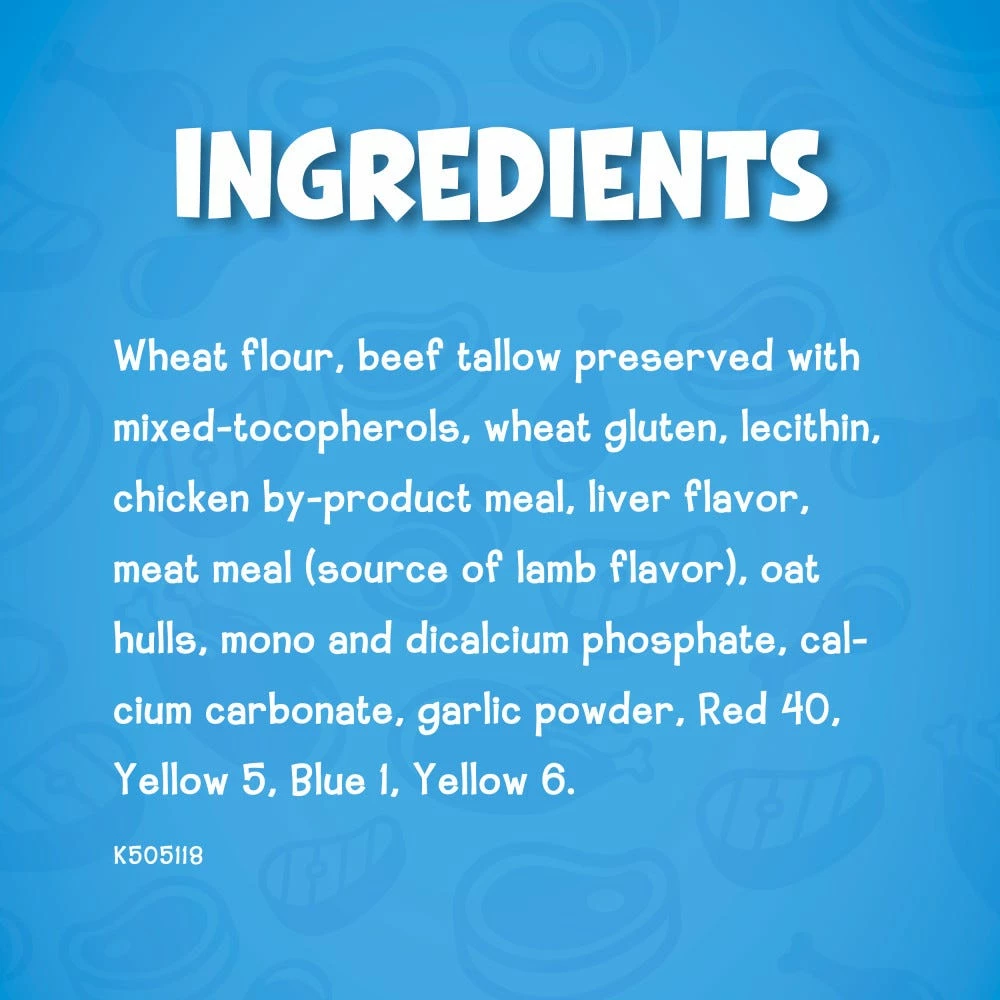 Wheat flour, beef tallow preserved with mixed-tocopherols, wheat gluten, mono and dicalcium phosphate, bacon flavor, dried cheese powder, natural and artificial peanut butter flavor, oat hulls, calcium carbonate, garlic powder, Red 40, Yellow 6, Yellow 5, Blue 1. E-5053